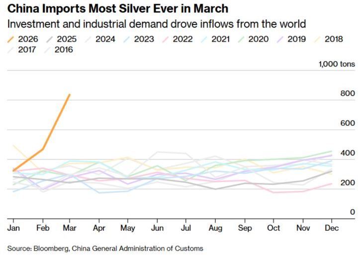 Rekordimporte bei Silber – China hebt sich deutlich von den Vorjahren ab: Der Chart zeigt die monatlichen Silberimporte Chinas im Vergleich der letzten Jahre. Während sich die Werte von 2016-2025 innerhalb einer relativ stabilen Bandbreite bewegen, sticht das Jahr 2026 deutlich hervor: Bereits in den ersten Monaten liegen die Importmengen über dem Durchschnitt, im März kommt es zu einem außergewöhnlich starken Anstieg. Dieser markante Ausbruch nach oben verdeutlicht, dass China aktuell deutlich mehr physisches Silber importiert als in den Jahren zuvor – ein klares Signal für eine stark gestiegene Nachfrage aus Industrie und Investment.