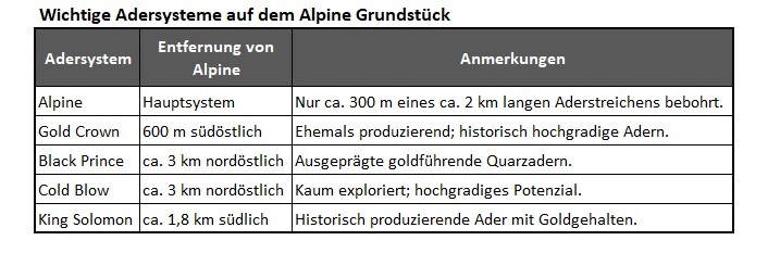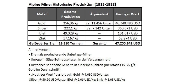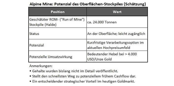 Die gezeigten Tabellen verdeutlichen die zentralen Stärken der Alpine Gold Mine: Eine hochgradige NI-43-101-Ressource, außergewöhnliche historische Produktion und ein umfangreicher Oberflächen-Stockpile, der im aktuellen Rekord-Goldpreisumfeld eine seltene Chance bietet, die schnell umsetzbar ist. Mit bestehenden Untertageentwicklungen, bedeutenden Gehalten und über 24.000 t leicht zugänglichem Material eröffnet Alpine dem Unternehmen die Möglichkeit, den derzeitigen Goldmarkt in Momentum und Mehrwert für die Aktionäre umzusetzen.