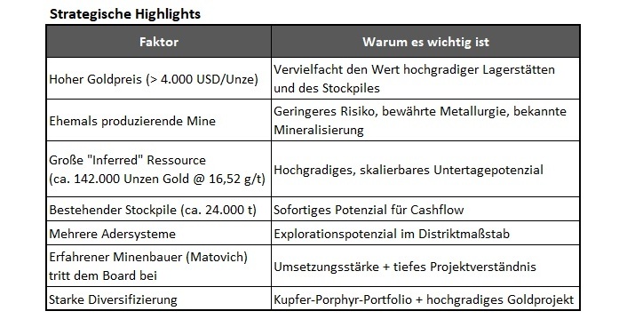 Nur wenige Unternehmen sind in diesem außergewöhnlichen Goldzyklus so hervorragend positioniert, um die Möglichkeiten eines hochgradigen Projekts unmittelbar für sich zu nutzen.