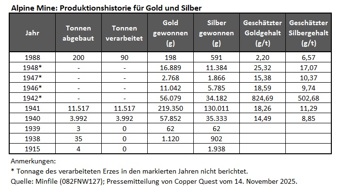 Das rund 4.612 Hektar große Alpine Grundstück liegt etwa 20 km nordöstlich der Stadt Nelson und beherbergt die ehemalige Untertage-Mine mit einer dokumentierten Produktion von rund 16.810 t mineralisiertem Adermaterial. Dieses Material enthielt 356 kg Gold, 222 kg Silber, 49.329 kg Blei und 17.167 kg Zink. Auf dem Projektgebiet befinden sich zudem 4 weitere bedeutende Adersysteme, die ebenfalls exploriert werden sollen – darunter die Quarzadern Black Prince und Cold Blow ca. 3 km nordöstlich der Alpine Mine, das Gold Crown Adersystem ca. 600 m südöstlich sowie die ehemals produzierenden King-Solomon-Untertagebaue 1,8 km südlich. Weitere Informationen zum Alpine Goldprojekt werden in den kommenden Wochen veröffentlicht. (Auszüge aus Copper Quests Pressemitteilung vom 14. November 2025)