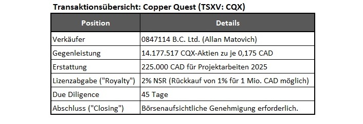 • Mit einem neuen Großaktionär mit echtem Engagement: Allan Matovich und seine Partner erhalten 14,18 Mio. Aktien und halten damit fast 20% an Copper Quest.