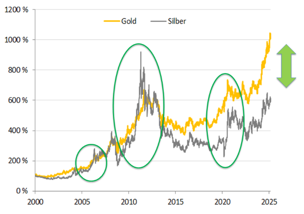 Dadurch ist prozentuale Anstieg von Silber dann stärker als der von Gold, wie es beispielsweise 2011 der Fall war. Damit ist auch in künftigen Haussephasen zu rechnen. Silber sollte dann erneut prozentual stärker steigen als Gold.
