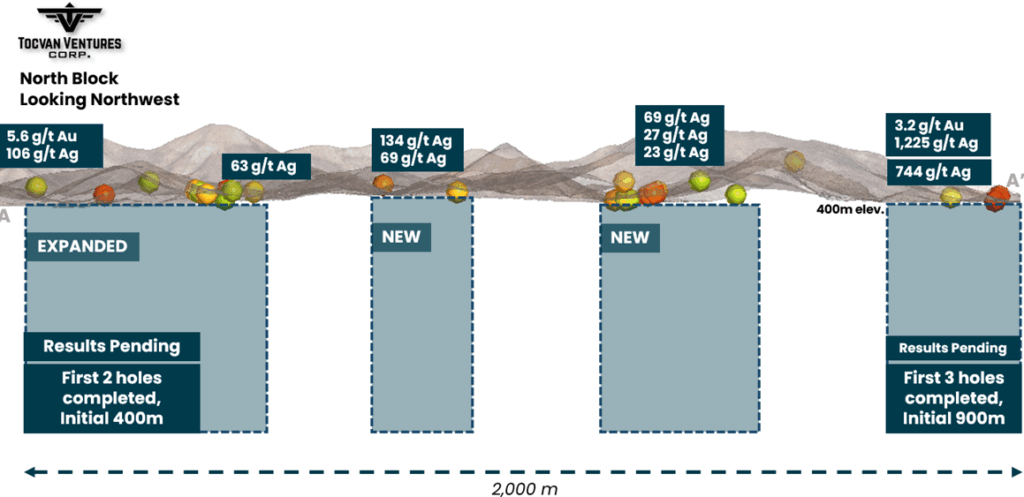 Bereits zuvor hatte Tocvan spektakuläre Gehalte aus dem North Block gemeldet, darunter Gesteinsproben mit über 1.200 g/t Silber. Doch das heute Präsentierte ist etwas völlig anderes: