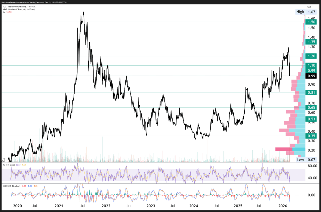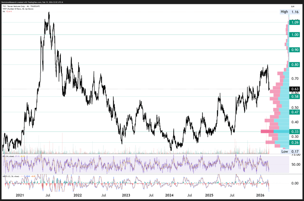Offenlegung von Interessen und rechtliche Hinweise: Nichts in diesem Bericht ist als Aufforderung zum Kauf oder Verkauf von Wertpapieren auszulegen. Rockstone, seine Eigentümer und der Autor dieses Berichts sind keine registrierten Broker-Dealer oder Finanzberater. Bevor Sie in Wertpapiere investieren, sollten Sie stets Ihren Finanzberater und einen registrierten Broker-Dealer konsultieren. Treffen Sie niemals eine Investitionsentscheidung ausschließlich auf Grundlage von Online- oder Druckberichten, einschließlich Berichten von Rockstone – insbesondere, wenn es sich um kleine, wenig gehandelte Unternehmen handelt. Der Autor dieses Berichts, Stephan Bogner, erhielt von Tocvan Ventures Corp. eine Vergütung in Höhe von 19.000 CAD für einen Zeitraum von 3 Monaten. Zudem hält er Wertpapiere von Tocvan und wird daher auch von einem Handelsvolumen- und Kursanstieg profitieren. Dies stellt einen erheblichen Interessenkonflikt dar, der die Objektivität dieser Berichterstattung beeinflussen kann. Der Autor kann die Wertpapiere jederzeit ohne Ankündigung handeln; dadurch können weitere Interessenkonflikte entstehen. Dieser Bericht ist als werbliche Veröffentlichung zu verstehen und ersetzt keine individuelle Anlageberatung. Alle Angaben entsprechen dem Stand zum Zeitpunkt der Veröffentlichung und können sich ohne Vorankündigung ändern. Eine Haftung für finanzielle Verluste, die durch Investitionen aufgrund dieses Berichts entstehen, ist ausgeschlossen. Die Ansichten von Rockstone und des Autors in Bezug auf die in den Berichten vorgestellten Unternehmen spiegeln ausschließlich die eigenen Einschätzungen wider und basieren auf Informationen aus öffentlichen Quellen, die als zuverlässig gelten. Rockstone und der Autor haben keine unabhängige Due-Diligence-Prüfung vorgenommen. Weder Rockstone noch der Autor garantieren die Genauigkeit, Vollständigkeit oder Nützlichkeit des Inhalts, noch dessen Eignung für bestimmte Zwecke. Ebenso gibt es keine Garantie, dass die erwähnten Unternehmen sich wie erwartet entwickeln oder dass vorgenommene Vergleiche mit anderen Unternehmen zutreffen. Bitte lesen Sie den vollständigen Disclaimer sorgfältig. Sollten Sie damit nicht einverstanden sein, nutzen Sie weder diese Website noch den Bericht. Durch die Nutzung der Website oder dieses Berichts erklären Sie sich mit dem Disclaimer einverstanden, unabhängig davon, ob Sie ihn vollständig gelesen haben. Die bereitgestellten Informationen sind allgemeiner und bildender Natur. Daten, Tabellen, Abbildungen und Bilder, sofern nicht anders gekennzeichnet oder verlinkt, stammen von Tradingview.com, Stockwatch.com, Tocvan Ventures Corp. und öffentlich zugänglichen Quellen.