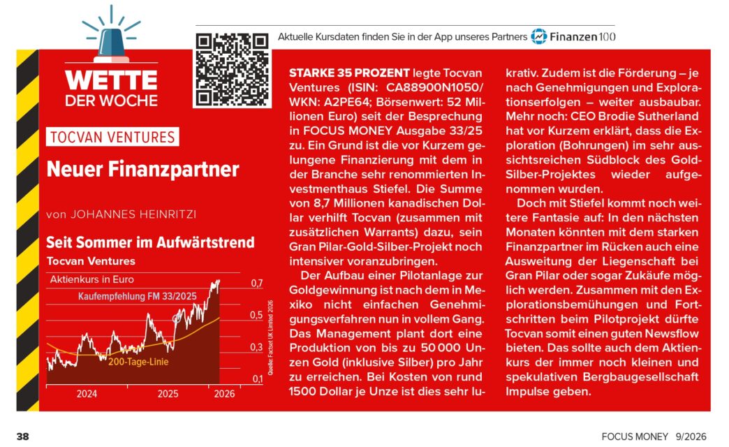 Genau das ist jetzt passiert: FOCUS Money hat erneut über Tocvan Ventures Corp. (CSE: TOC; WKN: A2PE64) berichtet, sowohl in der Printausgabe als auch in der Online-Ausgabe. Für ein wachsendes Explorations- und Minenentwicklungsunternehmen ist diese Kombination ein Reichweitenhebel, den man nicht unterschätzen darf.