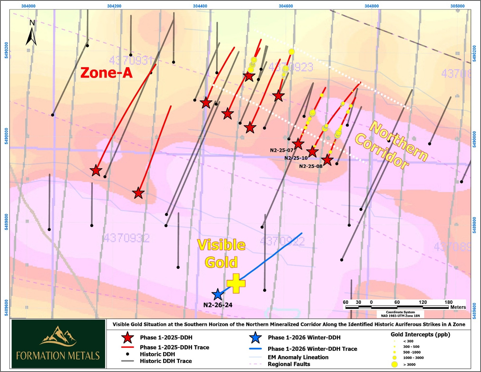Dies ist nicht nur deshalb von Bedeutung, weil sichtbares Gold ein starkes Zeichen für ein fruchtbares mineralisierendes System ist, sondern auch aufgrund der Position des Bohrlochs. N2-26-24 wurde als 400 m Step-out südlich von zuvor erfolgreichen Bohrungen im Korridor der A-Zone konzipiert.