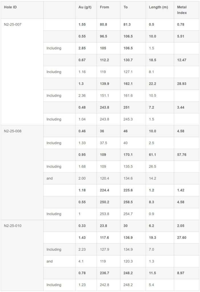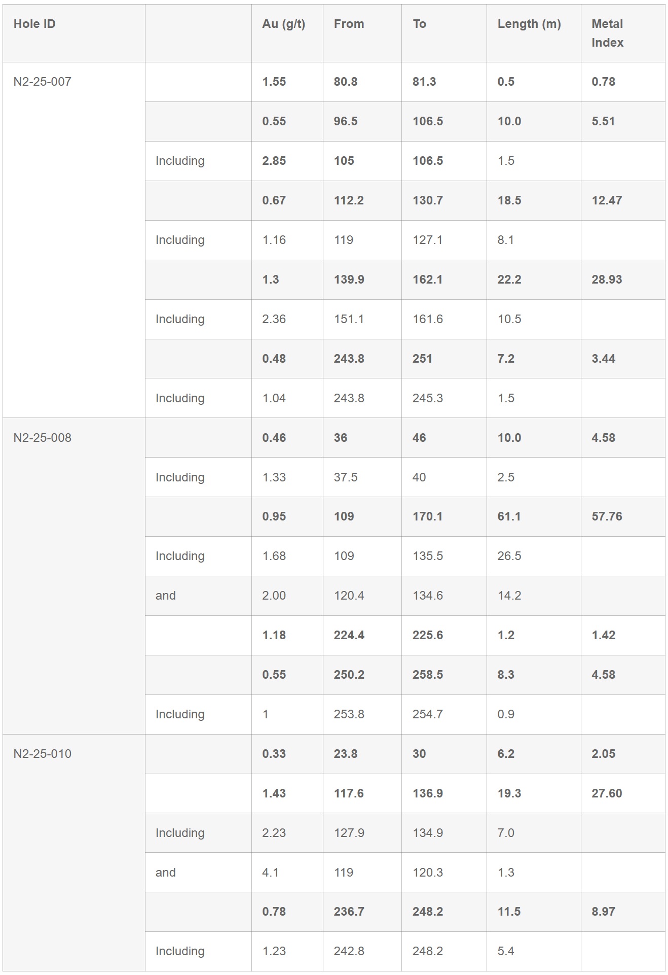 N2-25-008: 61,1 m @ 0,95 g/t Gold (inklusive 26,5 m @ 1,68 g/t Gold)