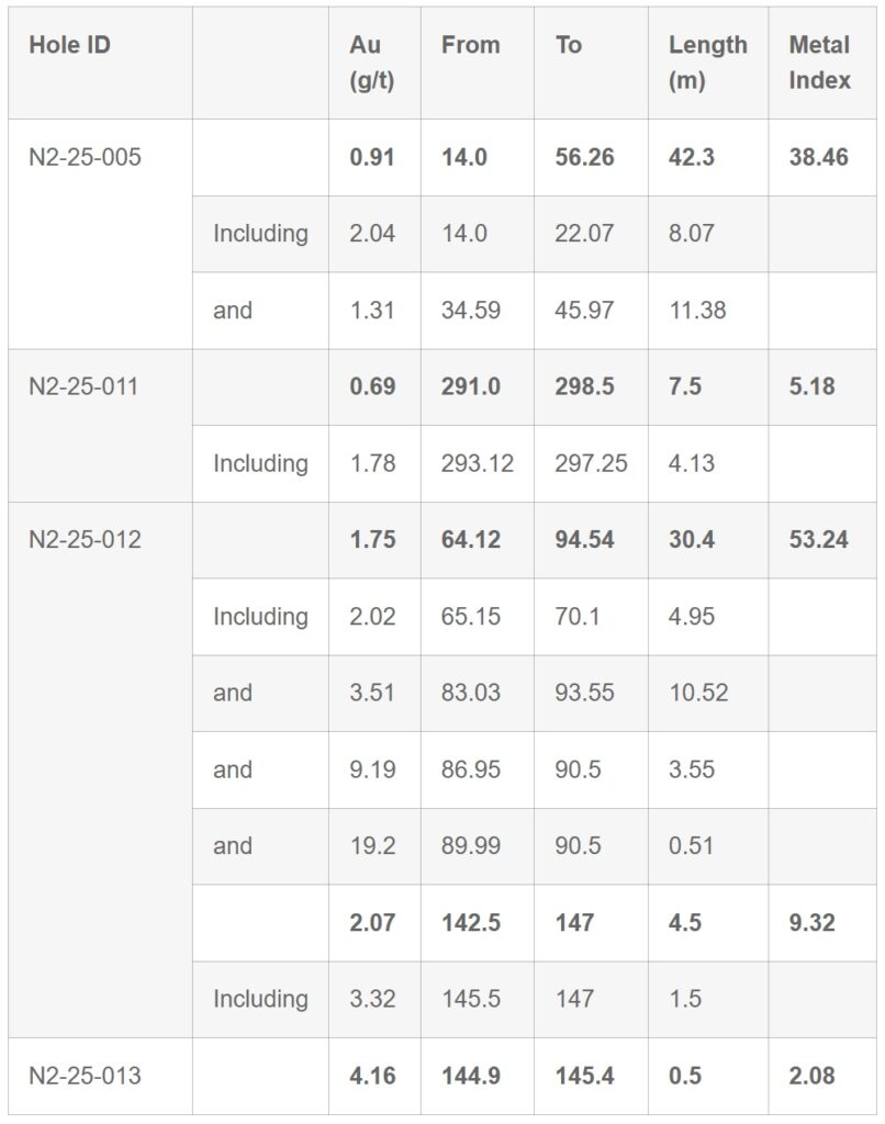 Die erste Runde der Bohrergebnisse umfasst die ersten 4 Bohrlöcher, mit den wichtigsten Highlights aus N2-25-005 und N2-25-012, ergänzt durch weitere Abschnitte in N2-25-011 und N2-25-013.