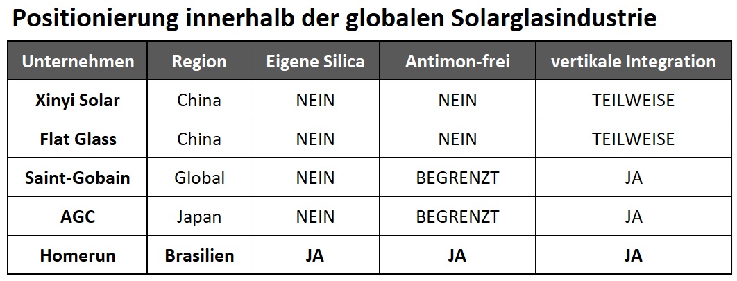 Die Marktstrategie von Homerun weicht hiervon deutlich ab. Anstatt primär über Skalierung zu konkurrieren, setzt das Unternehmen auf Integration und Spezialisierung. Die Kontrolle über hochreine, eisenarme Silica (ein zentraler Input für antimonfreies Solarglas) bietet ein Maß an Versorgungssicherheit, das vielen Produzenten fehlt. In einem Markt, in dem die Rohstoffqualität die Produktleistung maßgeblich beeinflusst, ist dies ein wesentlicher Wettbewerbsvorteil.