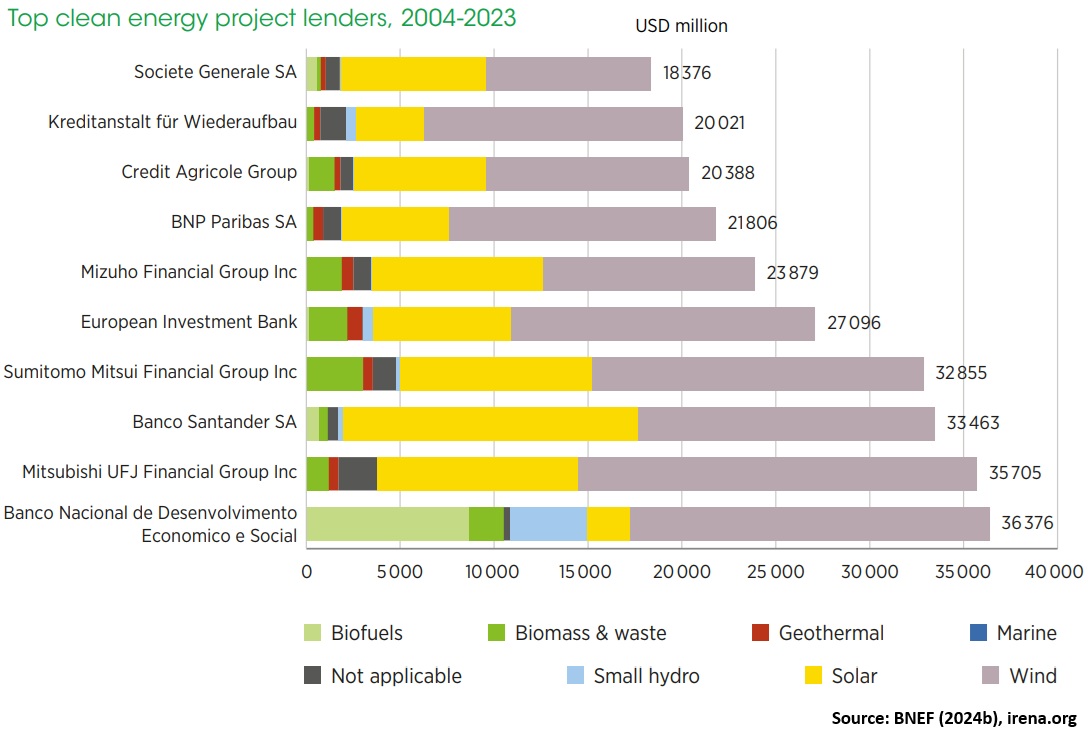 In Brasilien spielt die Banco Nacional de Desenvolvimento Econômico e Social (BNDES) eine entscheidende Rolle bei der Finanzierung von Infrastruktur im Bereich erneuerbarer Energien. Mit Vermögenswerten von über 820 Milliarden BRL (~141 Milliarden USD) gehört die BNDES zu den größten Entwicklungsbanken der Welt – direkt hinter der China Development Bank.