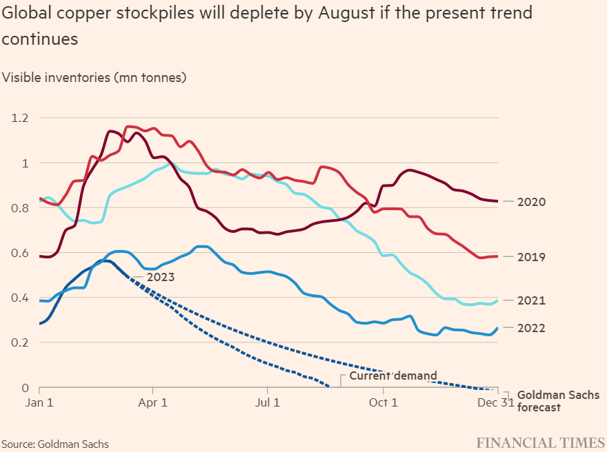 Laut Jeremy Weir, dem Vorstandsvorsitzenden von Trafigura, sind die Kupfermetallvorräte auf ein „ziemlich kritisches Stadium“ gesunken. Weir warnte auch davor, dass ein knappes Angebot das Tempo der Energiewende gefährden könnte. (Quelle)