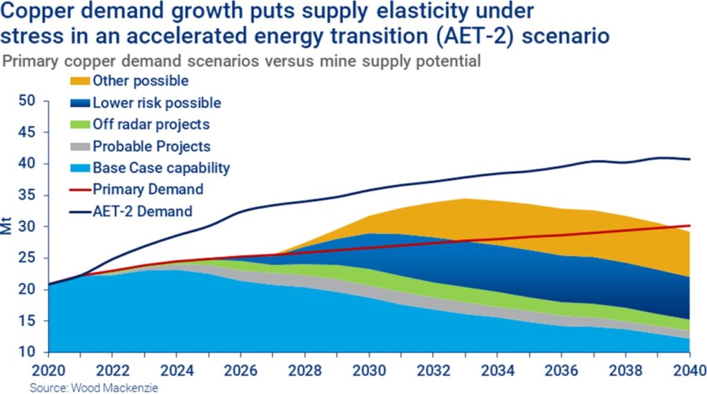 “Die Vorliebe der Führungskräfte von Minenunternehmen für sichere, kurzfristige Renditen hat zu einer massiven Unterinvestition in neue Kupferminen und Explorationen geführt, was die metallintensive Energiewende gefährdet. Der Übergang zur Dekarbonisierung wird riesige Mengen an Kupfer erfordern, um Übertragungsleitungen zu erweitern, neue Leitungen in erneuerbaren Energiequellen zu installieren und bestehende Geräte und Autos zu elektrifizieren. Trotz dieser fast sicheren Nachfrage hat die Minenindustrie in den letzten 10 Jahren einen Großteil ihrer Budgets von der Suche und der Entwicklung von großen neuen Kupferprojekten abgezogen… Wenn das Angebot nicht vorhanden ist, kann es zu einer Zerstörung der Nachfrage kommen…“ (Quelle)