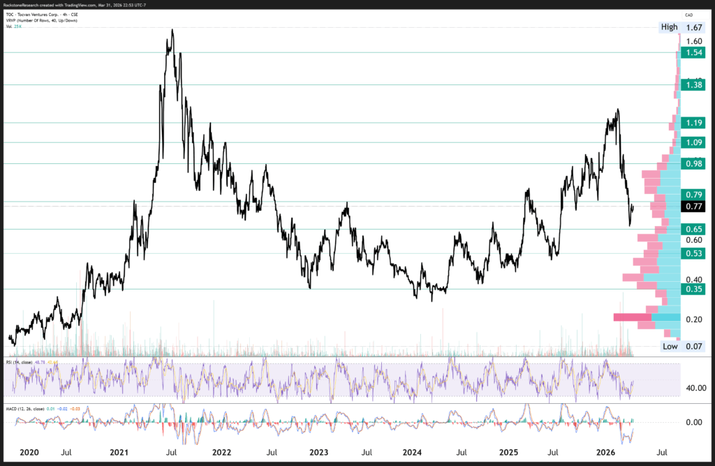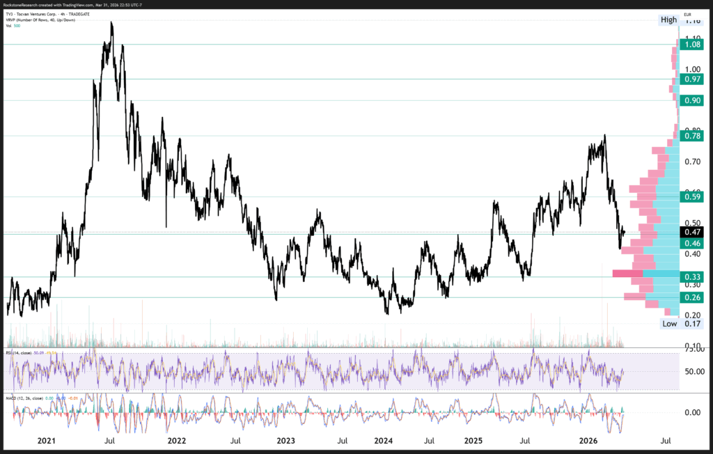 Offenlegung von Interessen und rechtliche Hinweise: Nichts in diesem Bericht ist als Aufforderung zum Kauf oder Verkauf von Wertpapieren auszulegen. Rockstone, seine Eigentümer und der Autor dieses Berichts sind keine registrierten Broker-Dealer oder Finanzberater. Bevor Sie in Wertpapiere investieren, sollten Sie stets Ihren Finanzberater und einen registrierten Broker-Dealer konsultieren. Treffen Sie niemals eine Investitionsentscheidung ausschließlich auf Grundlage von Online- oder Druckberichten, einschließlich Berichten von Rockstone – insbesondere, wenn es sich um kleine, wenig gehandelte Unternehmen handelt. Der Autor dieses Berichts, Stephan Bogner, erhielt von Tocvan Ventures Corp. eine Vergütung in Höhe von 19.000 CAD für einen Zeitraum von 3 Monaten. Zudem hält er Wertpapiere von Tocvan und wird daher auch von einem Handelsvolumen- und Kursanstieg profitieren. Dies stellt einen erheblichen Interessenkonflikt dar, der die Objektivität dieser Berichterstattung beeinflussen kann. Der Autor kann die Wertpapiere jederzeit ohne Ankündigung handeln; dadurch können weitere Interessenkonflikte entstehen. Dieser Bericht ist als werbliche Veröffentlichung zu verstehen und ersetzt keine individuelle Anlageberatung. Alle Angaben entsprechen dem Stand zum Zeitpunkt der Veröffentlichung und können sich ohne Vorankündigung ändern. Eine Haftung für finanzielle Verluste, die durch Investitionen aufgrund dieses Berichts entstehen, ist ausgeschlossen. Die Ansichten von Rockstone und des Autors in Bezug auf die in den Berichten vorgestellten Unternehmen spiegeln ausschließlich die eigenen Einschätzungen wider und basieren auf Informationen aus öffentlichen Quellen, die als zuverlässig gelten. Rockstone und der Autor haben keine unabhängige Due-Diligence-Prüfung vorgenommen. Weder Rockstone noch der Autor garantieren die Genauigkeit, Vollständigkeit oder Nützlichkeit des Inhalts, noch dessen Eignung für bestimmte Zwecke. Ebenso gibt es keine Garantie, dass die erwähnten Unternehmen sich wie erwartet entwickeln oder dass vorgenommene Vergleiche mit anderen Unternehmen zutreffen. Bitte lesen Sie den vollständigen Disclaimer sorgfältig. Sollten Sie damit nicht einverstanden sein, nutzen Sie weder diese Website noch den Bericht. Durch die Nutzung der Website oder dieses Berichts erklären Sie sich mit dem Disclaimer einverstanden, unabhängig davon, ob Sie ihn vollständig gelesen haben. Die bereitgestellten Informationen sind allgemeiner und bildender Natur. Daten, Tabellen, Abbildungen und Bilder, sofern nicht anders gekennzeichnet oder verlinkt, stammen von Tradingview.com, Stockwatch.com, Tocvan Ventures Corp. und öffentlich zugänglichen Quellen.