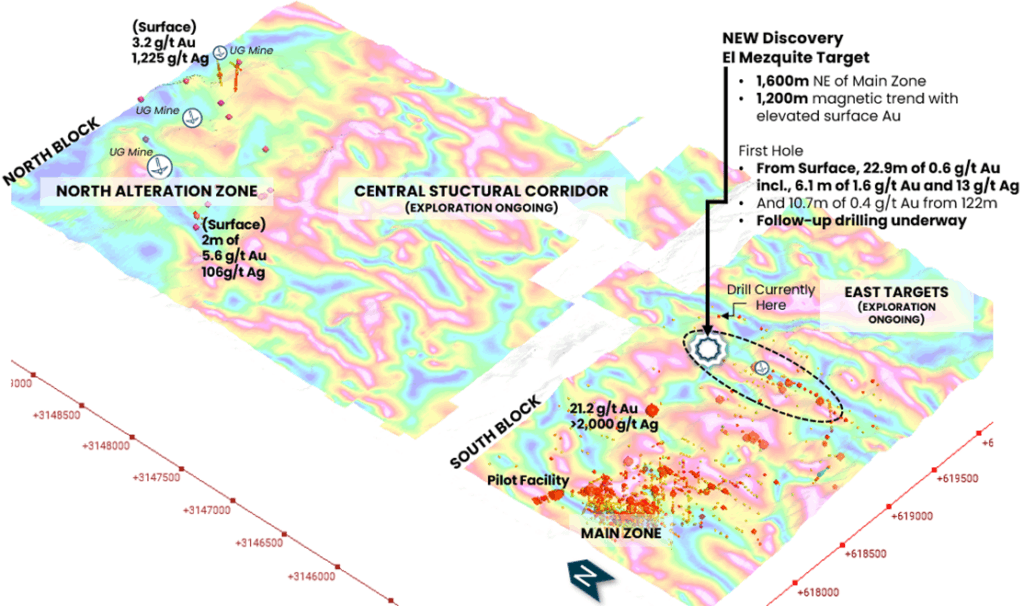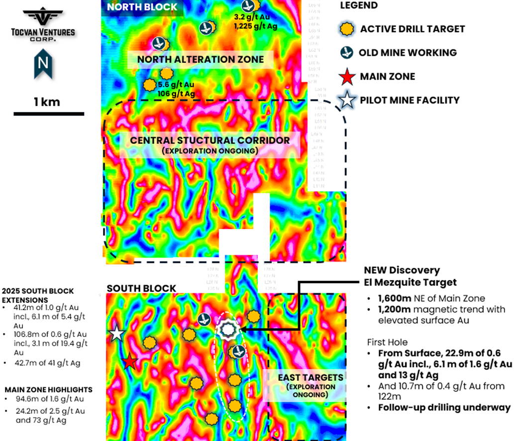 Die drohnengestützte Magnetik-Karte zeigt die bislang abgegrenzten Zielgebiete auf Gran Pilar. Grundlage dafür sind geologische Kartierung, Oberflächengeochemie und geophysikalische Auswertungen. Markiert ist auch das neue Zielgebiet El Mezquite, in dem Tocvan nun die erste bedeutende Step-Out-Entdeckung im South Block gemacht hat.