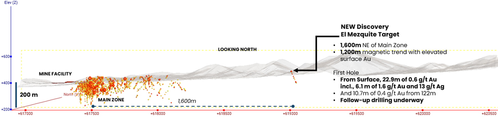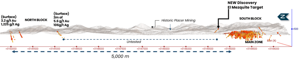 West-Ost-Querschnitt durch den South Block: Das Zielgebiet El Mezquite liegt rund 1.600 m östlich der Main Zone. Der dazwischenliegende Bereich wird derzeit erstmals systematisch exploriert und bebohrt. Weitere ca. 1.500 m weiter östlich beginnt bereits die Exploration zusätzlicher Zielgebiete.