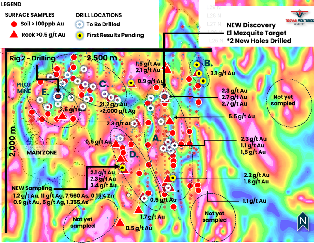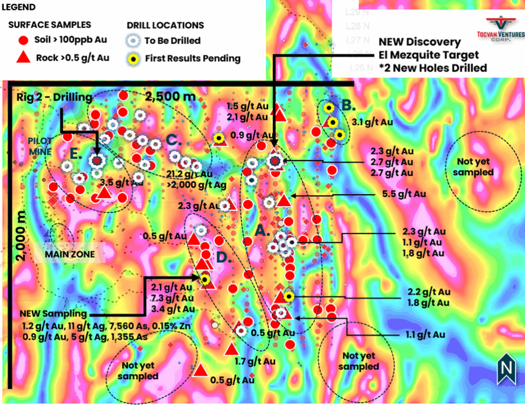 Bohrziele im South Block – Neue Entdeckung El Mezquite im Fokus: Detaillierte Magnetik-Karte (Drohnenmessung, RTP-Tilt-Derivat) mit den aktuell priorisierten Bohrzielen im South Block. Die Darstellung zeigt eine hohe Dichte an Oberflächenanomalien sowie bereits identifizierten Zielzonen entlang eines strukturellen Trends. Besonders hervorgehoben ist das neue Zielgebiet El Mezquite, das ca. 1.600 m nordöstlich der Main Zone Lagerstätte liegt und zusätzliches Explorationspotenzial eröffnet.