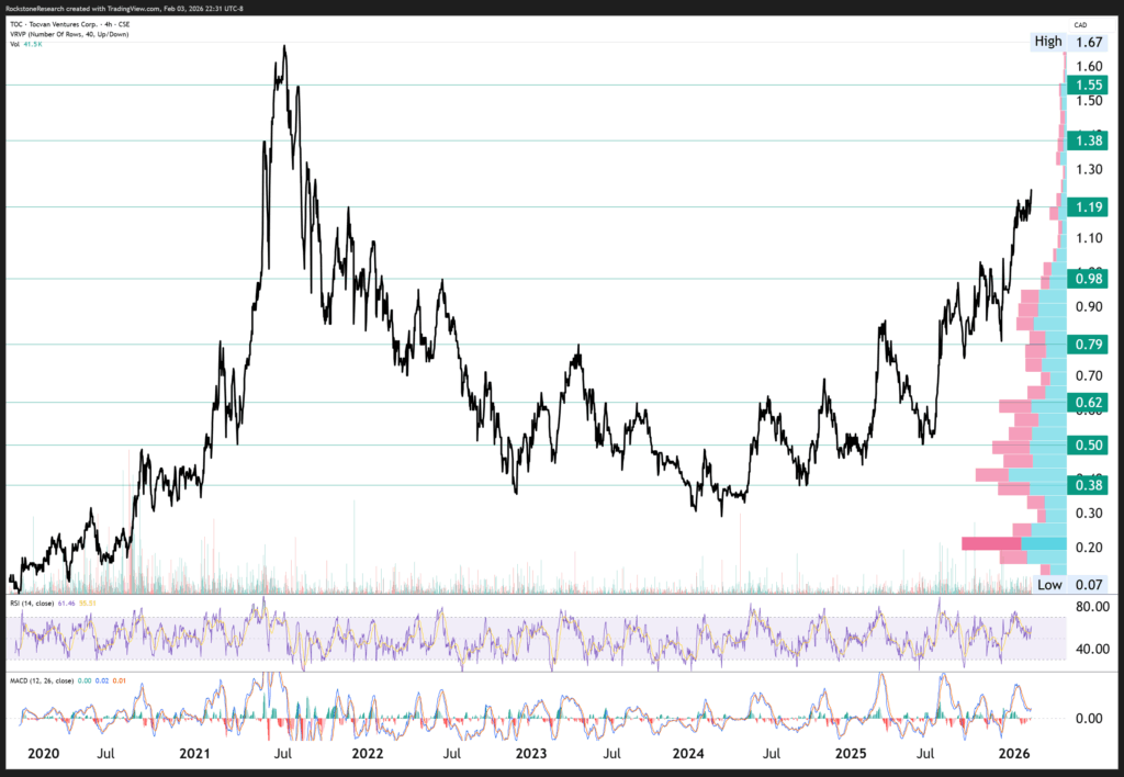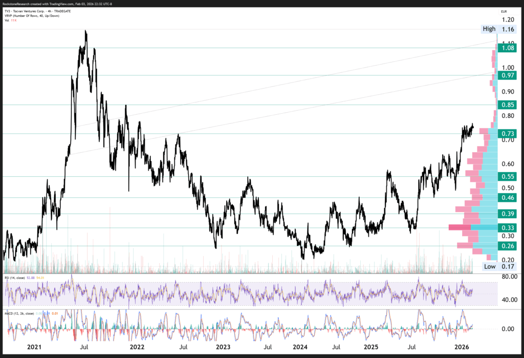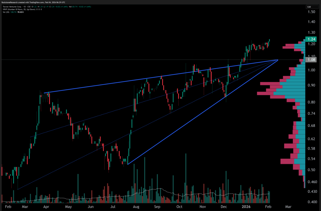 Offenlegung von Interessen und rechtliche Hinweise: Nichts in diesem Bericht ist als Aufforderung zum Kauf oder Verkauf von Wertpapieren auszulegen. Rockstone, seine Eigentümer und der Autor dieses Berichts sind keine registrierten Broker-Dealer oder Finanzberater. Bevor Sie in Wertpapiere investieren, sollten Sie stets Ihren Finanzberater und einen registrierten Broker-Dealer konsultieren. Treffen Sie niemals eine Investitionsentscheidung ausschließlich auf Grundlage von Online- oder Druckberichten, einschließlich Berichten von Rockstone – insbesondere, wenn es sich um kleine, wenig gehandelte Unternehmen handelt. Der Autor dieses Berichts, Stephan Bogner, erhielt von Tocvan Ventures Corp. eine Vergütung in Höhe von 19.000 CAD für einen Zeitraum von 3 Monaten. Zudem hält er Wertpapiere von Tocvan und wird daher auch von einem Handelsvolumen- und Kursanstieg profitieren. Dies stellt einen erheblichen Interessenkonflikt dar, der die Objektivität dieser Berichterstattung beeinflussen kann. Der Autor kann die Wertpapiere jederzeit ohne Ankündigung handeln; dadurch können weitere Interessenkonflikte entstehen. Dieser Bericht ist als werbliche Veröffentlichung zu verstehen und ersetzt keine individuelle Anlageberatung. Alle Angaben entsprechen dem Stand zum Zeitpunkt der Veröffentlichung und können sich ohne Vorankündigung ändern. Eine Haftung für finanzielle Verluste, die durch Investitionen aufgrund dieses Berichts entstehen, ist ausgeschlossen. Die Ansichten von Rockstone und des Autors in Bezug auf die in den Berichten vorgestellten Unternehmen spiegeln ausschließlich die eigenen Einschätzungen wider und basieren auf Informationen aus öffentlichen Quellen, die als zuverlässig gelten. Rockstone und der Autor haben keine unabhängige Due-Diligence-Prüfung vorgenommen. Weder Rockstone noch der Autor garantieren die Genauigkeit, Vollständigkeit oder Nützlichkeit des Inhalts, noch dessen Eignung für bestimmte Zwecke. Ebenso gibt es keine Garantie, dass die erwähnten Unternehmen sich wie erwartet entwickeln oder dass vorgenommene Vergleiche mit anderen Unternehmen zutreffen. Bitte lesen Sie den vollständigen Disclaimer sorgfältig. Sollten Sie damit nicht einverstanden sein, nutzen Sie weder diese Website noch den Bericht. Durch die Nutzung der Website oder dieses Berichts erklären Sie sich mit dem Disclaimer einverstanden, unabhängig davon, ob Sie ihn vollständig gelesen haben. Die bereitgestellten Informationen sind allgemeiner und bildender Natur. Daten, Tabellen, Abbildungen und Bilder, sofern nicht anders gekennzeichnet oder verlinkt, stammen von Tradingview.com, Stockwatch.com, Tocvan Ventures Corp. und öffentlich zugänglichen Quellen. Das Titelbild wurde von 123rf.com bezogen und lizenziert.