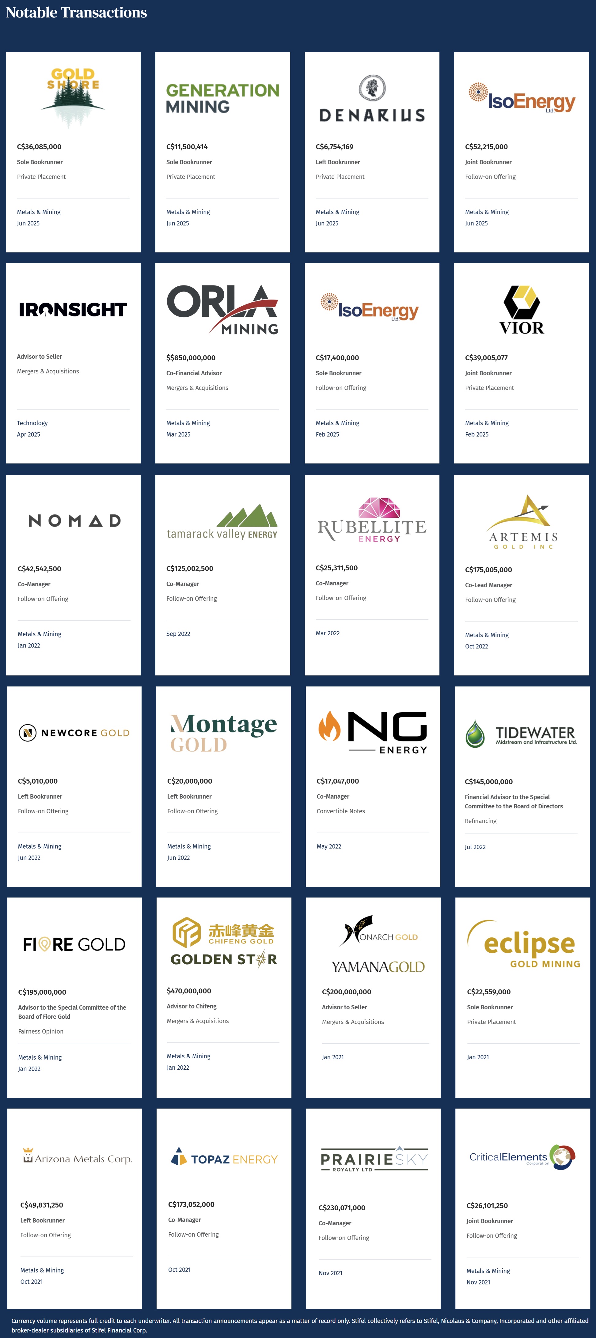 Die folgende Übersicht stammt von Stifel Canada, also jener Einheit, die kanadische Rohstoffunternehmen regelmäßig bei Finanzierungen begleitet. Sie zeigt, dass insbesondere im Mining-Bereich Transaktionen im einstelligen bis mittleren zweistelligen Millionenbereich keine Ausnahme, sondern Teil eines kontinuierlichen Deal-Flows sind.