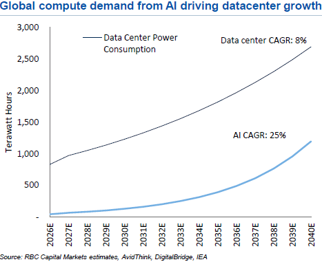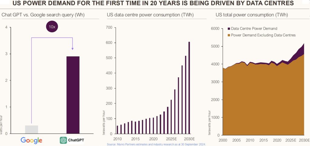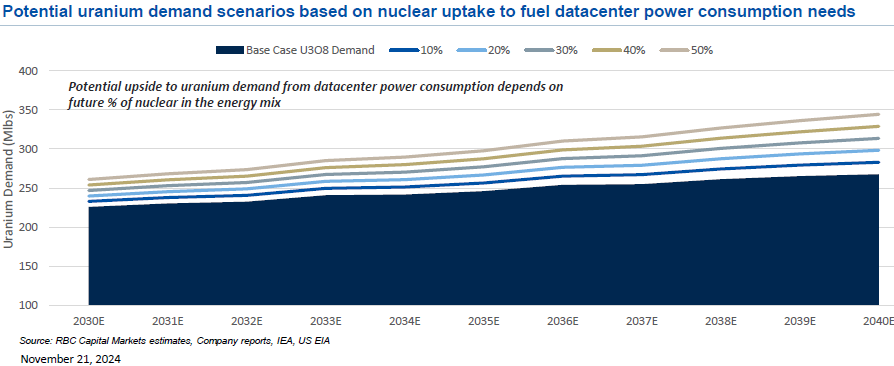 “Basierend auf unseren Stromprognosen für Rechenzentren könnten ca. 10% des Energiemixes aus Kernenergie bis 2040 einem zusätzlichen Uranbedarf von etwa 15 Mio. Pfund (+6%) entsprechen, der in unserem Basisszenario nicht berücksichtigt ist… “ (RBC Capital Markets im November 2024)