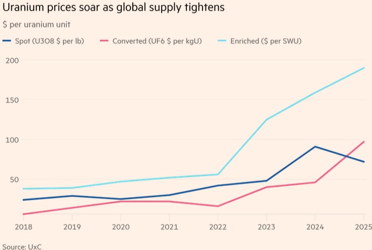 Der westliche Markt für Kernbrennstoffe sieht sich mit einer sich zuspitzenden Uran-Versorgungskrise konfrontiert. Nigers jüngste Verstaatlichung der Bergbauaktivitäten von Orano hat die Uranversorgung im Westen weiter belastet. Niger, das 5% der weltweiten Uranproduktion ausmacht und zuvor 15–20% des Uranbedarfs Frankreichs deckte, hat seine Exporte eingestellt, was auf eine Verlagerung der Kontrolle über seine Ressourcen und eine mögliche Zusammenarbeit mit nicht-westlichen Nationen wie Russland und der Türkei hindeutet. Dies trägt zur Verwundbarkeit der westlichen Uranmärkte bei, die bereits stark von nicht-alliierten („non-alied“) Ländern wie Kasachstan, Usbekistan und Russland abhängig sind.