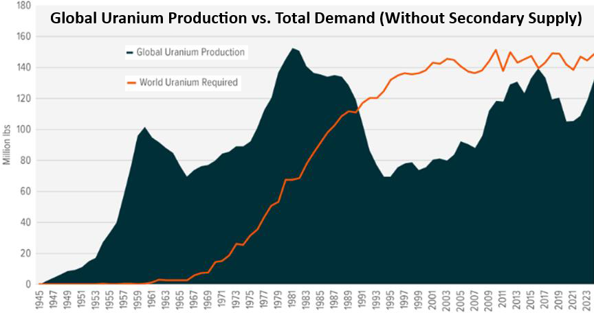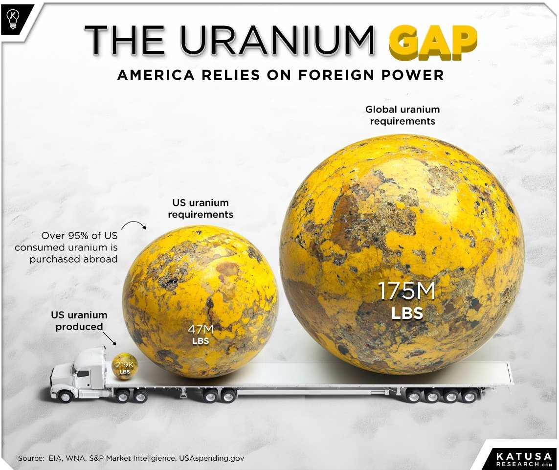 Da die Nachfrage nach Kernbrennstoffen bereits jetzt in die Höhe schießt, während wir weltweit am Rande einer massiven Erweiterung der KI-Datenserver stehen, die von der Verfügbarkeit zuverlässiger, kohlenstofffreier Kernenergie rund um die Uhr abhängt, gibt es heute keinen Weg, um in diesem Jahrzehnt und bis weit in die 2030er Jahre hinein ein Gleichgewicht zwischen Angebot und Nachfrage auf dem Uranmarkt zu erreichen.