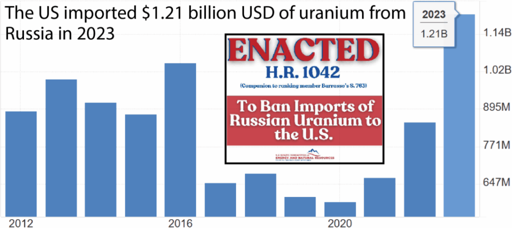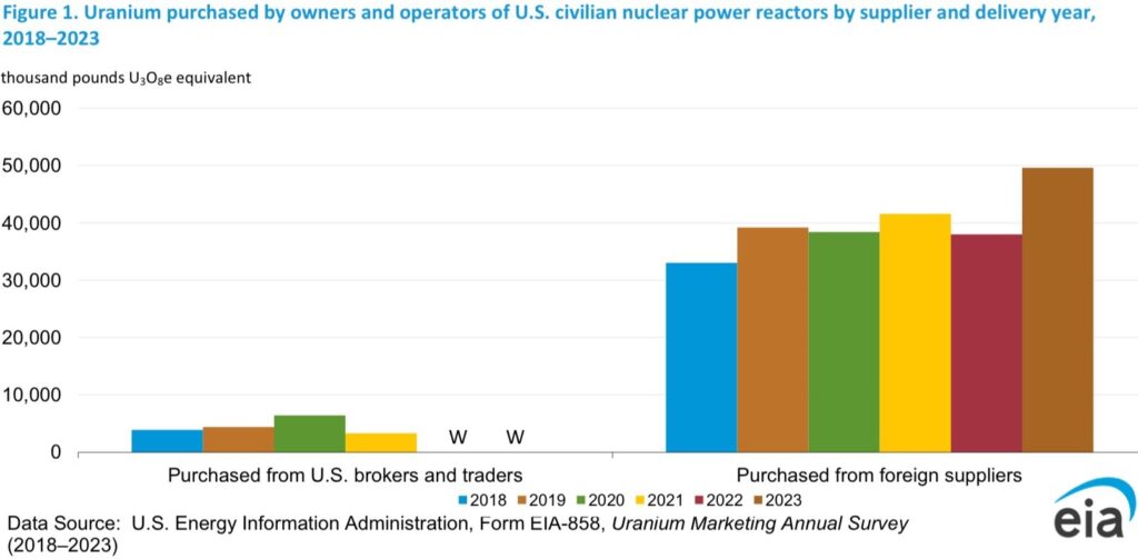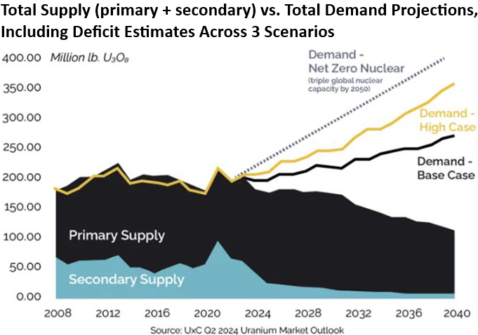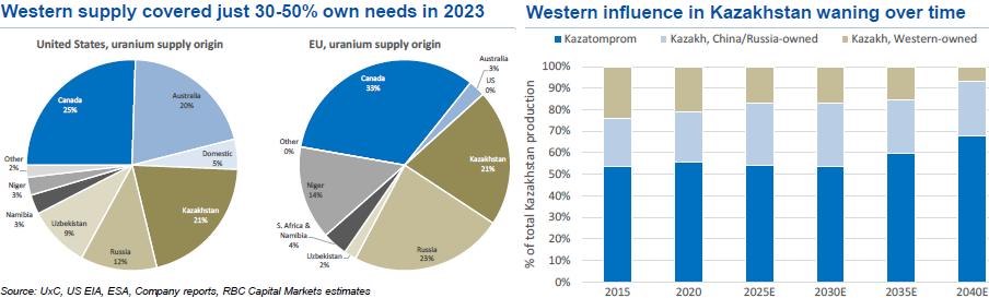 Im Jahr 2023 wurden nur 50% des Uranbedarfs der USA und 30% des Uranbedarfs der EU von mit dem Westen verbündeten Lieferanten gedeckt. Zwar wird erwartet, dass das Angebot aus dem Westen in den nächsten 10 Jahren zunimmt, doch wird es höchstwahrscheinlich weiterhin unzureichend sein, da anhaltende Defizite prognostiziert werden und bis Mitte der 2030er Jahre aufgrund der Erschöpfung zahlreicher Uranminen weltweit die Gefahr schwerwiegender Engpässe besteht. Ohne erhebliche Investitionen in neue Minenprojekte und diversifizierte Lieferketten könnten diese Defizite die langfristige Tragfähigkeit der Ausweitung der Kernenergie im Westen gefährden.