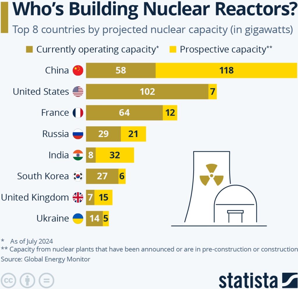 “China könnte in den nächsten 10 Jahren weitere 100 Kernreaktoren genehmigen, so eine Branchenlobbygruppe. Damit würde sich das Land zum weltweit größten Betreiber von Atomkraftwerken und möglicherweise zu einem bedeutenden Exporteur dieser Technologie entwickeln. Nachdem Peking im Jahr 2024 die Genehmigung für die Rekordzahl von 11 Reaktoren erteilt hat, könnte sich die Regierung bis 2035 zu einem „realistischen Ziel“ von 10 neuen Genehmigungen pro Jahr verpflichten… China ist bereits auf dem besten Weg, die USA und Frankreich zu überholen und bis zum Ende des Jahrzehnts zum weltweiten Marktführer in der Kernenergieerzeugung zu werden. Das Land hat mehr Reaktoren im Bau als jedes andere Land, nachdem in den letzten 2 Jahren jeweils 10 genehmigt wurden… Während andere Länder seit der Katastrophe von Fukushima im Jahr 2011 das Tempo der Einführung von Kernkraftwerken verlangsamt haben, hat China die Entwicklung vorangetrieben. Das internationale Interesse an der stabilen und emissionsfreien Energiequelle hat in den letzten Jahren wieder zugenommen, da Länder nach Möglichkeiten suchen, ihre Netze zu dekarbonisieren. Als einer von nur einer Handvoll Anbietern der Technologie positioniert sich Peking als kostengünstiger Exporteur in Entwicklungsländer.“ (Bloomberg im Dezember 2024)