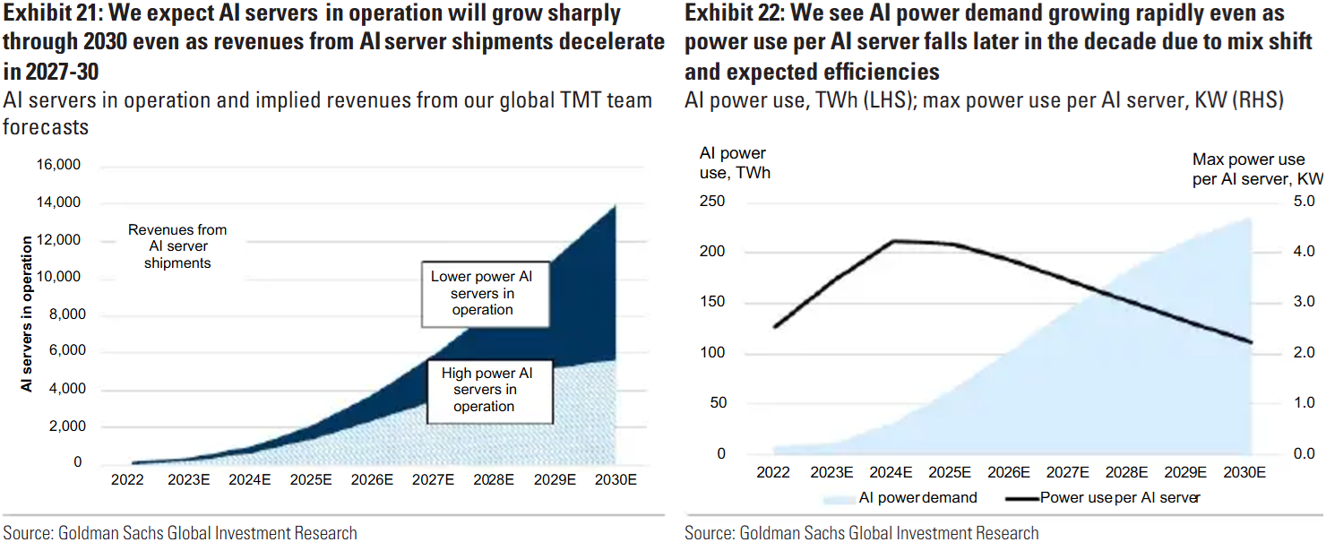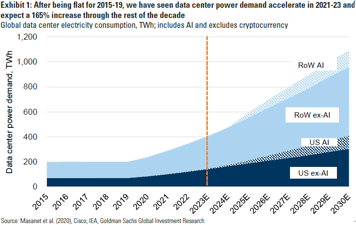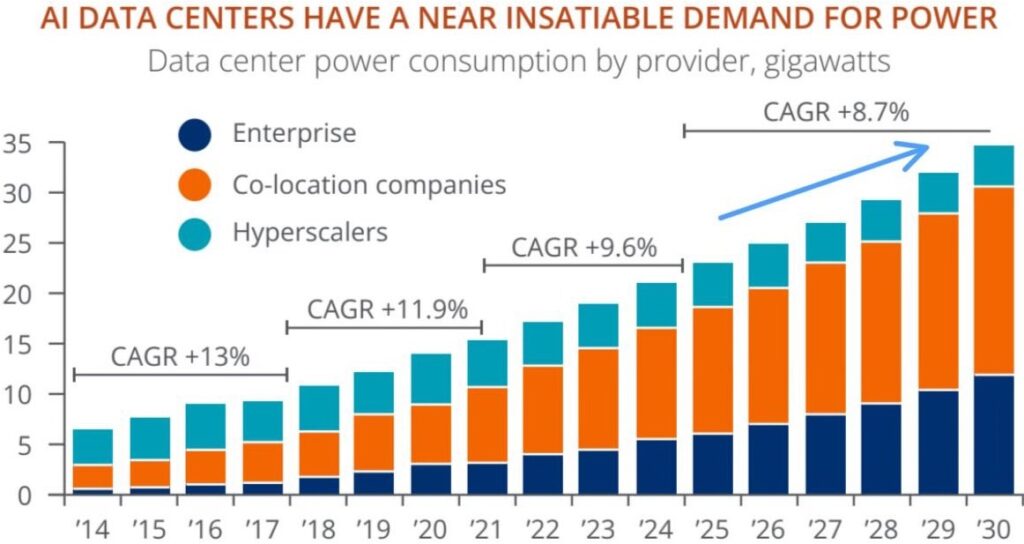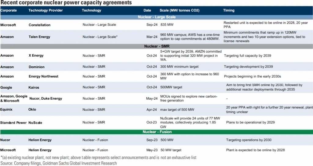 “Da der Strombedarf globaler Rechenzentren nach unseren Schätzungen bis 2030 gegenüber 2023 um 165% steigen wird, sehen wir weiterhin, dass Big Tech einen umfassenden Ansatz bei der Strombeschaffung verfolgt und kohlenstoffarme Lösungen anstrebt… Während wir weiterhin davon ausgehen, dass erneuerbare Energien bis 2030 nur 40% des Strombedarfs von Rechenzentren decken werden (der Großteil des verbleibenden Bedarfs wird durch Erdgas gedeckt), sehen wir Potenzial für einen deutlichen Anstieg des Anteils der Kernenergie in den 2030er Jahren.