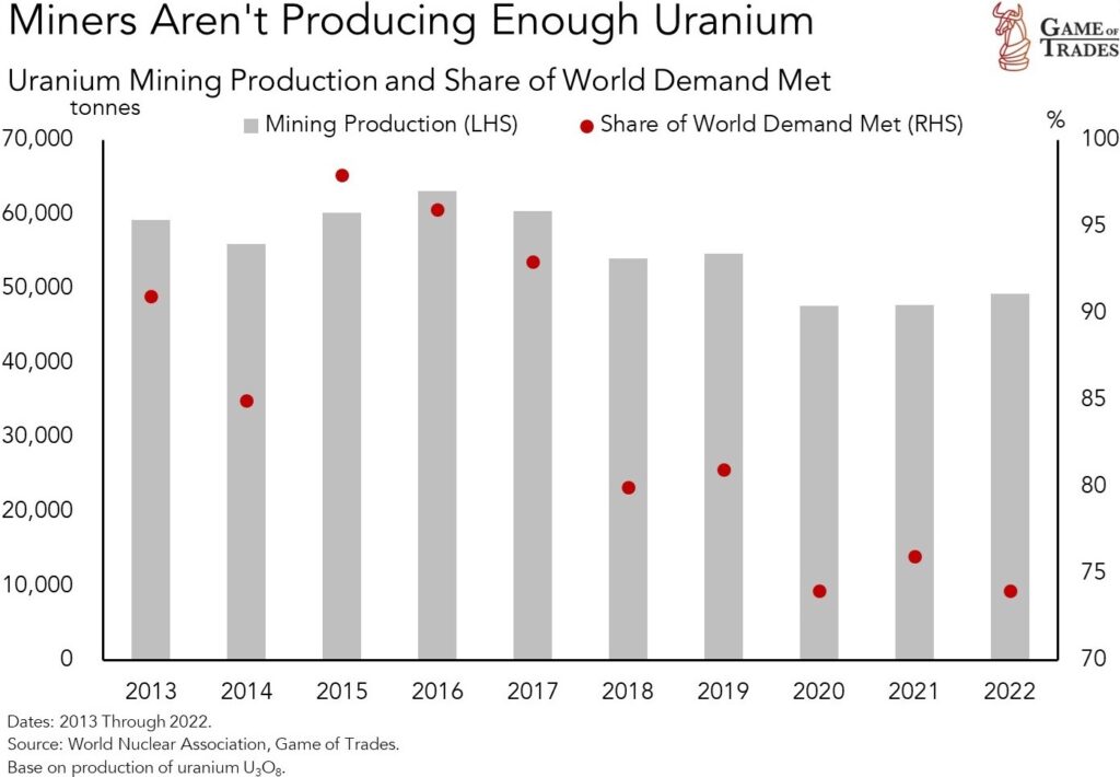 “Die Uran-Verknappung ist in diesem Jahrzehnt ein echtes Problem. Im Jahr 2022 deckte die Produktion nur etwa 75% der weltweiten Nachfrage. Und jetzt haben die beiden größten Minenunternehmen, Kazatomprom und Cameco, bereits mit Produktionsproblemen zu kämpfen. Das Versorgungsdefizit wird dieser Anlageklasse einen kräftigen Rückenwind verschaffen.“ (Quelle)