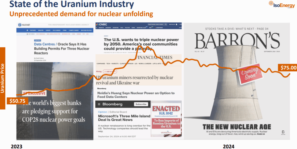 Angesichts steigender Kosten für Ausrüstung, Materialien und Arbeitskräfte sind jetzt weitaus höhere Preise erforderlich, um Anreize für den Bau neuer Uranminen zu schaffen und so die Versorgungslücke zu schließen. Branchenberater gehen davon aus, dass ein langfristiger Vertragspreis von etwa $150 USD/Pfund, was fast dem Doppelten des heutigen Preises von $80 USD entspricht, erforderlich ist, um die volle Produktion der 2,1 Mrd. Pfund ungedeckten Vertragsnachfrage bis 2040 zu erreichen. Cameco hat uns gerade mitgeteilt, dass die neuen Verträge, über die sie verhandeln, sich auf den Spotmarkt beziehen und Preisobergrenzen von $130 USD/Pfund oder höher haben. NexGen hat kürzlich neue Lieferverträge über 5 Mio. Pfund mit Preisobergrenzen von $150 USD/Pfund angekündigt!