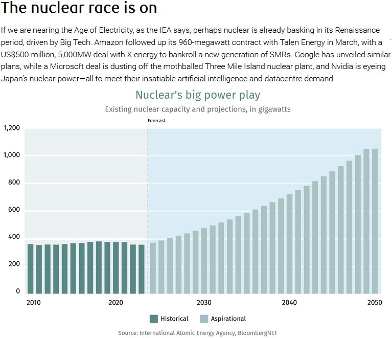 “Da sich der weltweite Strombedarf bis 2050 verdoppeln wird und der Strombedarf von Rechenzentren allein bis 2026 dem jährlichen Strombedarf Japans entsprechen wird, haben 25 Nationen und 14 Banken ihre Unterstützung für eine Verdreifachung der weltweiten Kernenergiekapazität bis 2050 zugesagt.“ (Quelle)