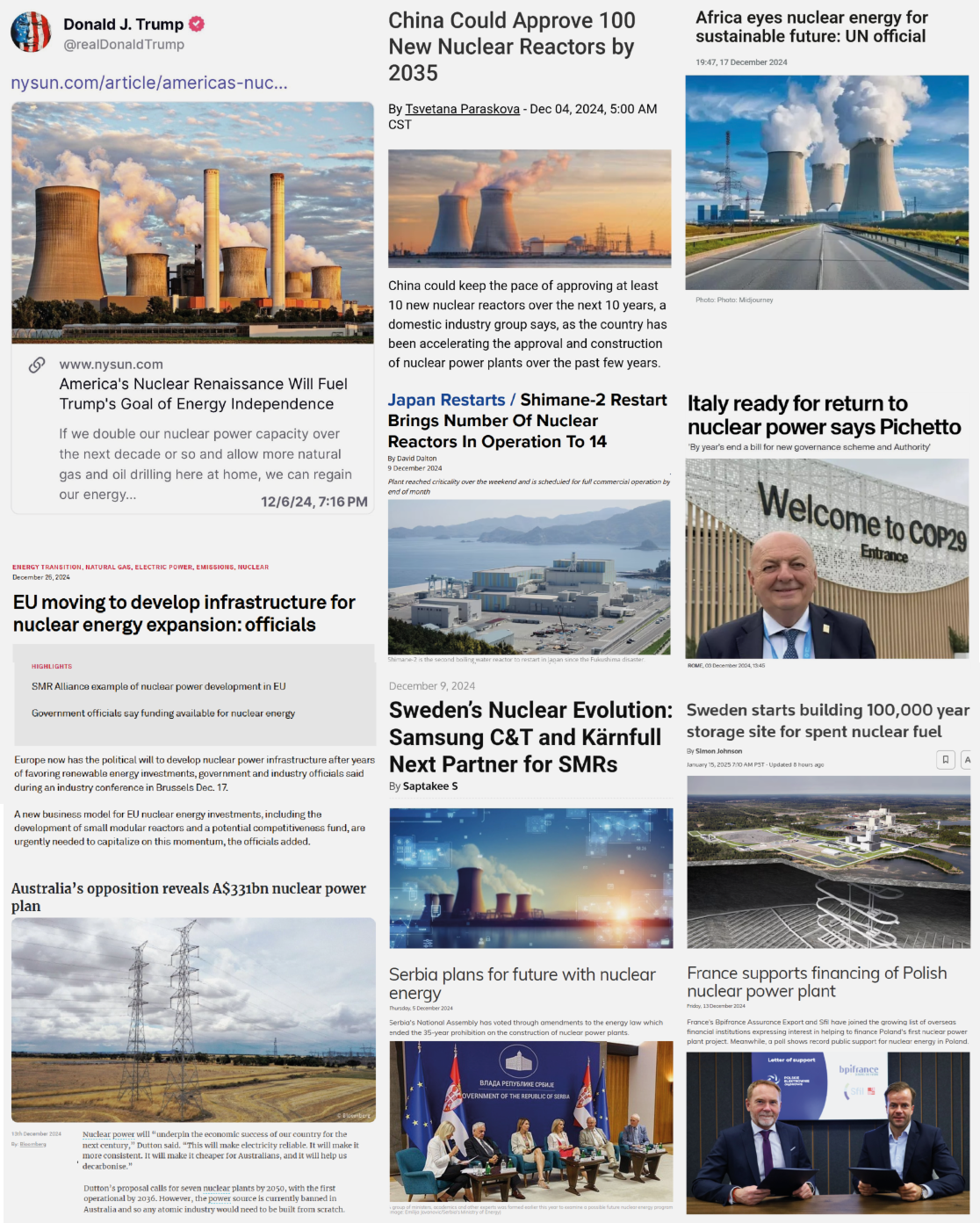 - September 2024: Constellation Energy investiert $1,6 Mrd. USD in die Wiederinbetriebnahme von Three Mile Island (Ort einer teilweisen Kernschmelze im Inland im Jahr 1979), unterstützt durch Microsoft, das einen 20-jährigen Stromabnahmevertrag zu $100 USD/MWh unterzeichnet.