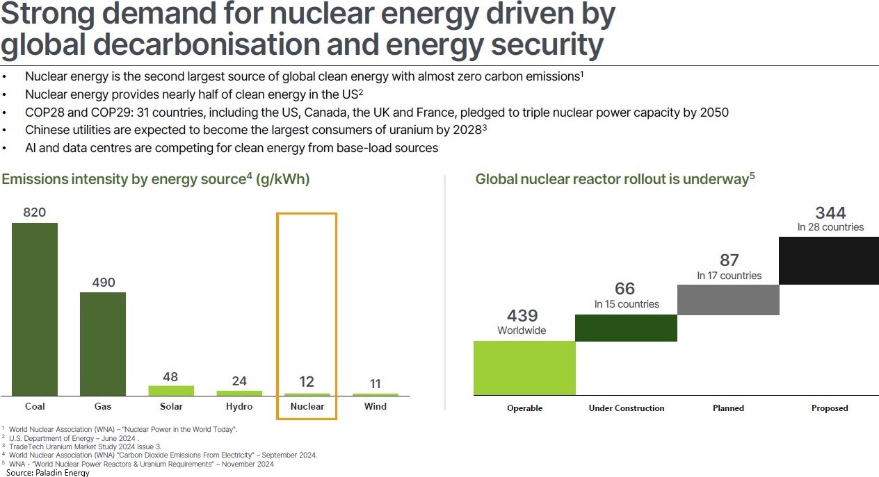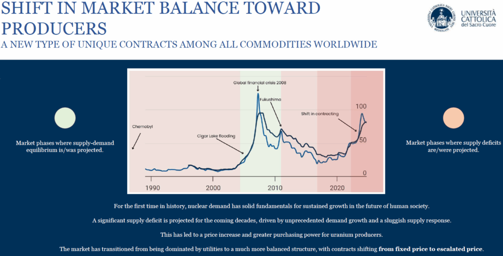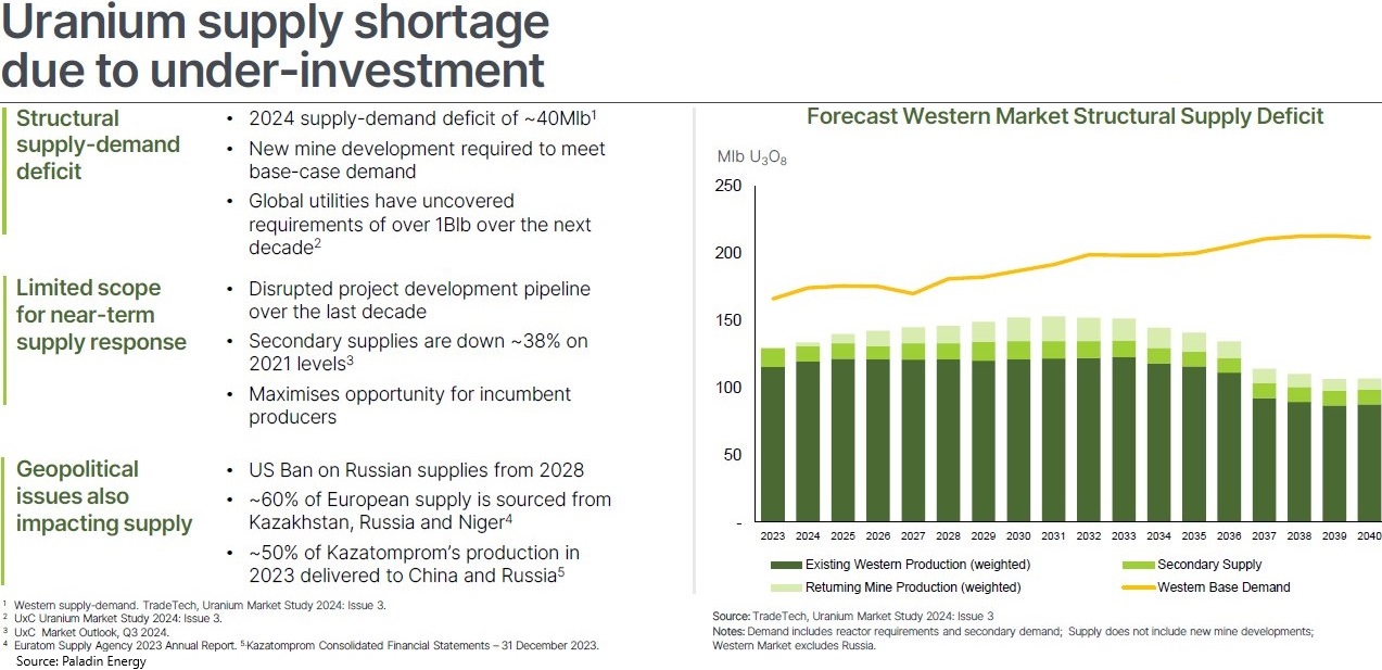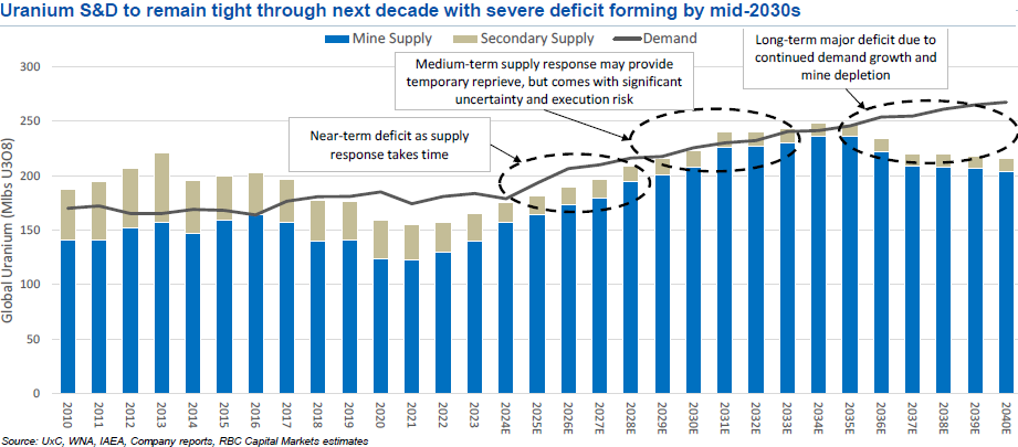 “Kurzfristiges Defizit bedeutet Aufwärtspotenzial für den Preis in den nächsten Jahren: Wir gehen davon aus, dass der Uranmarkt bis 2030 defizitär bleiben wird, da es einige Zeit dauert, bis das Angebot auf die gestiegene Nachfrage reagiert. Wir sehen diesen Zeitraum als am anfälligsten für einen angebotsseitigen Schock (geopolitische Spannungen, Verzögerungen beim Hochfahren von Minen), insbesondere für die westlichen Märkte, während die Nachfrage aufgrund einer bedeutenden Reaktorbasis und langer Vorlaufzeiten für die Inbetriebnahme neuer Kernreaktoren bereits feststeht.“ (RBC Capital Markets im November 2024)