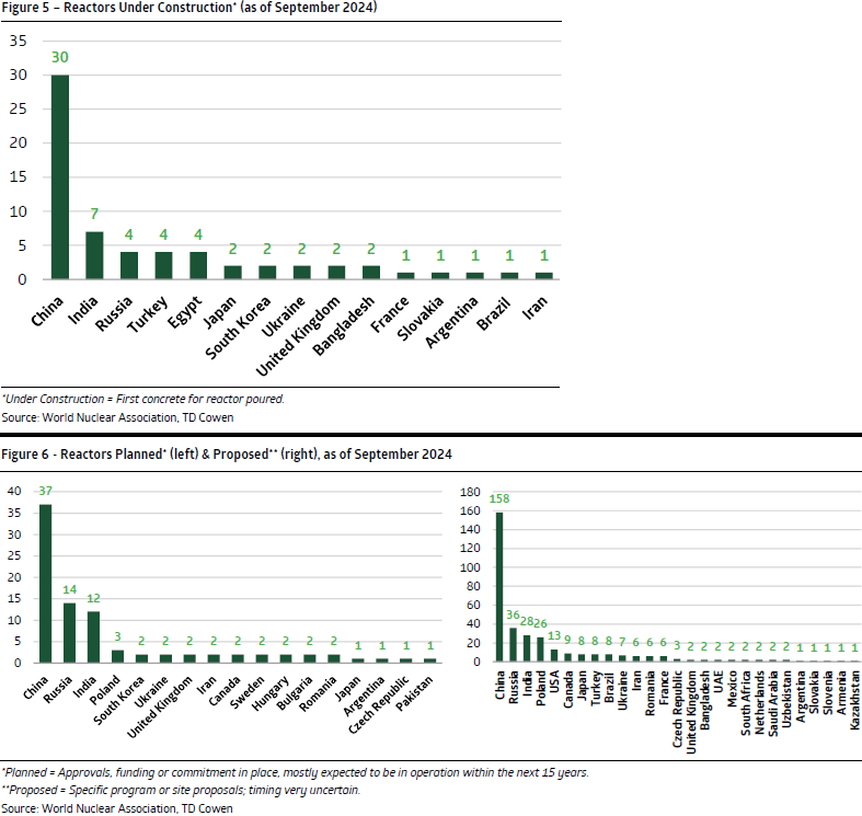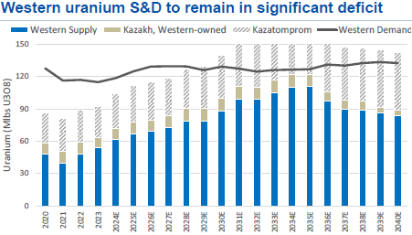 “Westliches Uran S&D [„Supply & Demand“; Angebot & Nachfrage] im Defizit, anfällig für Versorgungsschocks: Wir sehen den westlichen Uranmarkt in einem erheblichen Defizit, wobei >50% des Angebots aus nicht angeglichenen Ländern stammen – wir betrachten den westlichen Kernbrennstoffmarkt als Nordamerika, West- und Mitteleuropa, Südkorea und Japan. Im Jahr 2023 wurden nur etwa 50% des Uranbedarfs der USA und etwa 30% des Bedarfs der EU durch Lieferungen aus dem westlichen Lager gedeckt, wobei Kasachstan, Russland, Usbekistan und Niger den Großteil der verbleibenden Lieferungen ausmachten. Kurzfristig, aber auch längerfristig großes Versorgungsrisiko: Wir glauben, dass diese Situation die westlichen Märkte verwundbar macht, insbesondere in den nächsten Jahren, da es einige Zeit dauern wird, bis die westlichen Lieferungen anlaufen. Selbst wenn das westliche Angebot bis Ende der 2020er/Anfang der 2030er Jahre steigt, wird das westliche S&D weiterhin ein Defizit aufweisen und stark von Kasachstan abhängig sein, wo der westliche Einfluss schwindet. Längerfristig wird sich das Defizit aufgrund der Erschöpfung der Minen ab Mitte der 2030er Jahre erheblich vergrößern und könnte ein potenzielles Risiko für langfristige Pläne zum Bau von Kernkraftwerken darstellen, wenn nicht mit mehr Investitionen gegengesteuert wird.“ (RBC Capital Markets im November 2024)