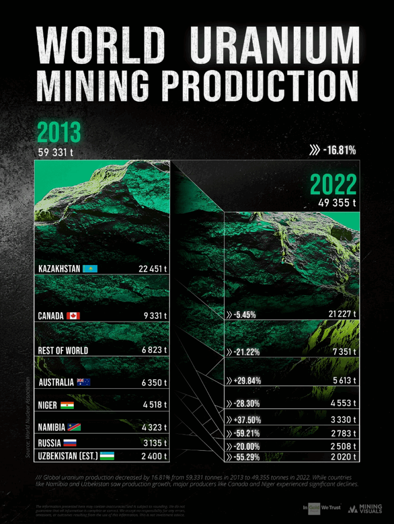 “Die [obige] Grafik zeigt die Veränderungen in der weltweiten Uranproduktion von 2013 bis 2022. In den letzten 10 Jahren ist die weltweite Uranproduktion um 16,81% zurückgegangen, was auf eine Mischung aus Marktdynamik, betrieblichen Herausforderungen und strategischen Anpassungen zurückzuführen ist. Ein Hauptgrund für diesen Rückgang sind die Folgen der Katastrophe von Fukushima im Jahr 2011, die zu einem deutlichen Rückgang der weltweiten Nachfrage führte, was wiederum zu anhaltend niedrigen Uranpreisen und weit verbreiteten Produktionskürzungen führte.