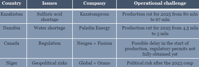 - Betriebliche Herausforderungen: Kasachstan, der weltweit größte Uranproduzent, sah sich mit technischen Problemen wie Schwefelsäureknappheit konfrontiert, was zu einem Rückgang seiner Produktion beitrug.
