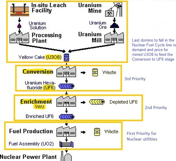 „Für Uraninvestoren ist es wichtig zu verstehen, dass der Prozess der Beschaffung von Reaktorbrennstoff durch Kernkraftwerke 4 Hauptschritte umfasst, von denen 3 die Vergabe von Dienstleistungen und einer den Kauf des zu verarbeitenden Uranbrennstoffs betreffen.