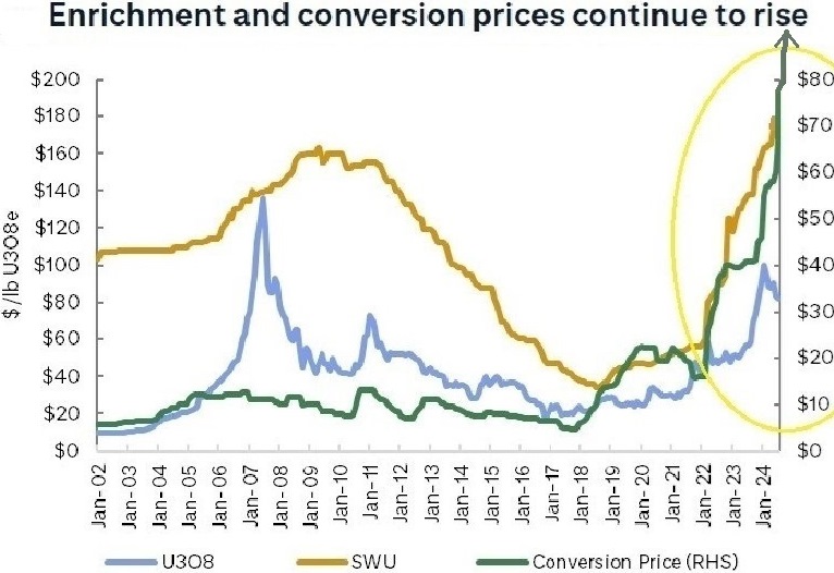 Wie Grant Isaac von Cameco diese Woche auf einer Goldman-Sachs-Konferenz mitteilte, erreichen die Preise für Anreicherungs-SWU und Umwandlung Allzeithochs, da die Auftragsvergabe für diese Dienstleistungen „bereits auf Ersatzrate erfolgt!“ Brennstoffkäufer können die Beschaffung des U3O8-Materials verzögern, müssen aber irgendwann damit beginnen, neue Lieferverträge mit Produzenten auf Ersatzratenniveau abzuschließen.