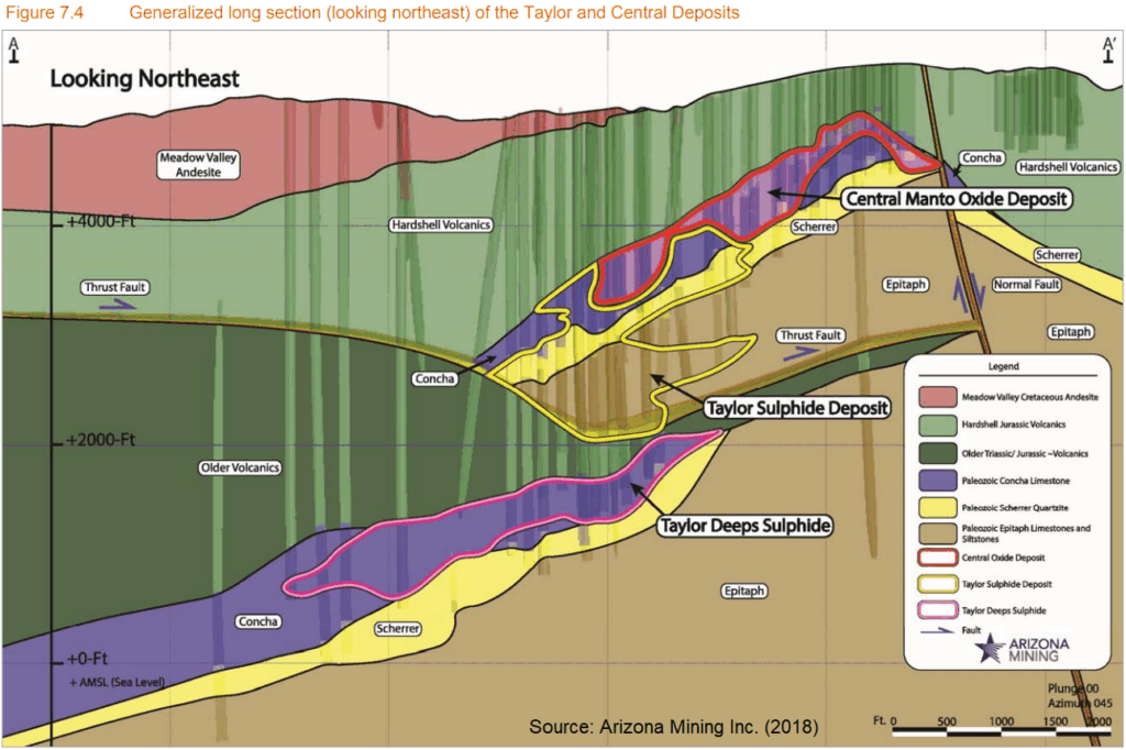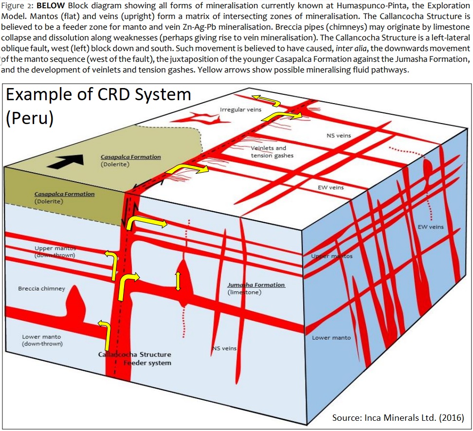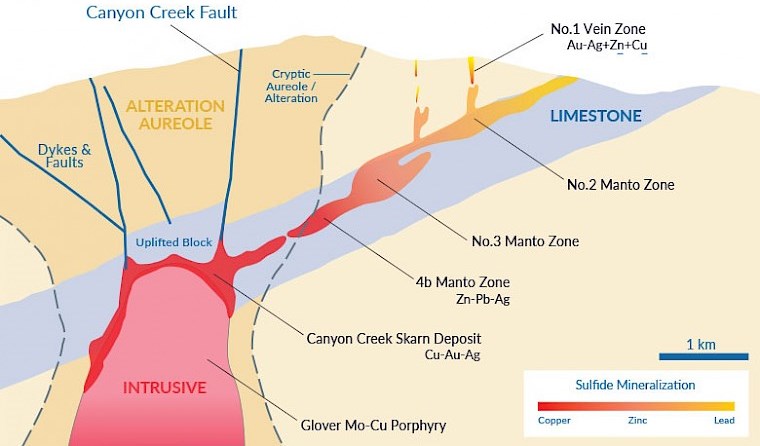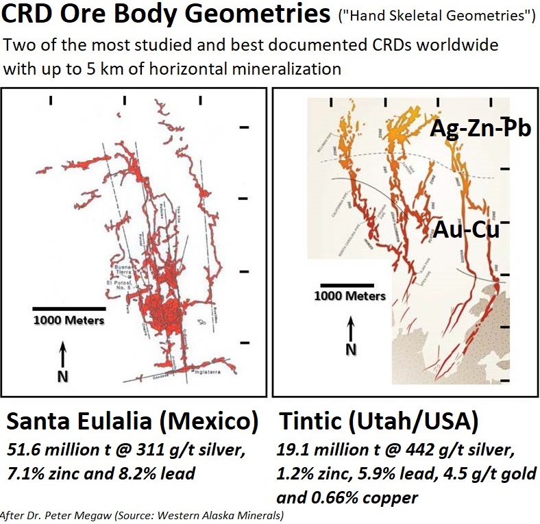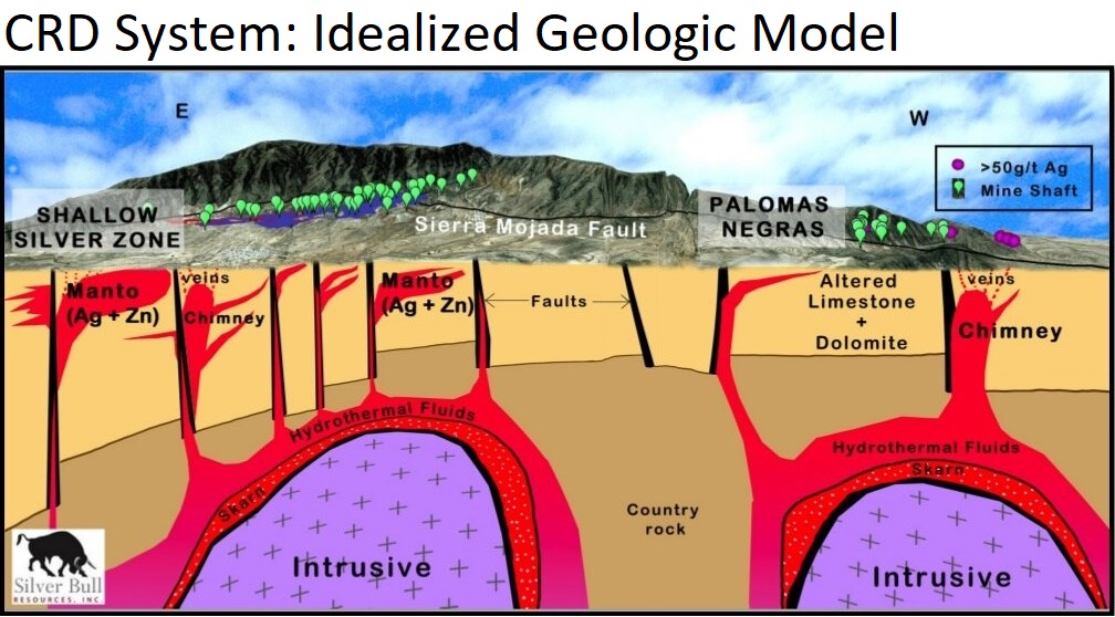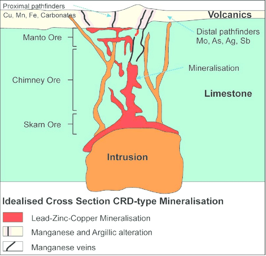 “CRDs sind Körper mit metallischen Mineralen, die durch die Reaktion heißer magmatischer Fluide mit Karbonatgestein wie Kalkstein oder Dolomit entstehen. Die heißen, metallhaltigen Flüssigkeiten werden von der Wärmequelle, einer magmatischen Intrusion (Glover Mo-Cu Porphyry), nach oben getrieben und lösen das reaktive Karbonatgestein auf, wenn sie auf dieses treffen. Durch diese Reaktion verändert sich die Chemie der Flüssigkeit, sodass sie metallische Sulfidminerale ausfällt, die häufig Kupfer, Zink, Blei und bedeutende Edelmetalle wie Gold und Silber enthalten. Die Metallsulfidminerale "verdrängen/ersetzen" das Karbonat, wodurch eine massive Sulfidmineralisation entsteht. Näher an der Quelle der Flüssigkeiten liegt die Mineralisation häufig in Form von Kupfer-Gold-Skarn (Zone 421 und darüber liegende Canyon Creek-Zonen) vor, das in Zink-Blei-Silber-Mantos (Zone 4b Manto; Zone Nr. 3 Manto; Zone Nr. 2 Manto) und Schlote/Chimneys übergeht. In der Peripherie des Systems, die kühleren Flüssigkeiten fallen Silber- und Gold-Adern aus (No.1 Vein Zone Ag-Au ±Zn±Cu) und bilden in den Rändern des Systems.“