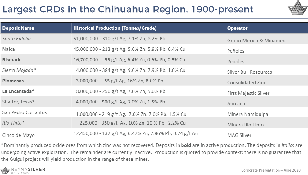 - Die CRD-Lagerstätten machen etwa 4 Mrd. Unzen oder 40% der insgesamt in Mexiko produzierten 10 Mrd. Unzen Silber aus. Sie stehen nach den epithermalen Adern Mexikos an zweiter Stelle der historischen Silberproduktion.
