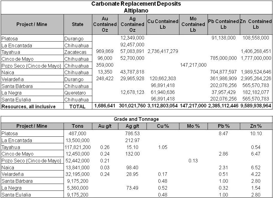 “Hochtemperatur-Karbonat-Erze im mexikanischen Altiplano sind durch metallreiche tertiäre Intrusivkörper gekennzeichnet, die in strukturell vorbereitetes Karbonat-Grundgestein, entweder Kalkstein oder Dolomit, eindringen... Mantos, Chimneys (Schlote) und Massivsulfid-Pods sind die 3 wichtigsten morphologischen Typen und befinden sich im Allgemeinen weit entfernt von Intrusionszentren. Bei CRD handelt es sich um große Systeme mit 25-100 Mio. t hochgradiger Erze, die erhebliche Mengen an Silber, Blei und Zink liefern. Bis heute haben 10 CRD im Altiplano Ressourcen (alles inklusive) mit mehr als 1,7 Mio. Unzen Au, 300 Mio. Unzen Ag, 3,1 Mrd. Pfund Cu, 147 Mio. Pfund Mo, 2,4 Mrd. Pfund Pb und 9,6 Mrd. Pfund Zn veröffentlicht. La Encantada von First Majestic verfügt über die größte Silberressource mit über 92,5 Mio. Unzen bei einem Gehalt von 213 g/t Ag, während La Platosa von Excellon Resources mit 12,3 Mio. Unzen Ag mit einem Gehalt von 786 g/t Ag den höchsten Gehalt aufweist. Weitere bedeutende Liegenschaften sind Tayahua von Frisco mit Ressourcen von über 970.000 Unzen Au, 57 Mio. Unzen Ag, 2,7 Mrd. Pfund Cu und 1,4 Mrd. Pfund Zn mit Gehalten von 0,26 g/t Au, 15,1 g/t Ag, 1% Cu und 0,5% Zn, und MAG Silver´s Cinco de Mayo mit Ressourcen von über 96.000 Unzen Au, 52,7 Mio. Unzen Ag, 785 Mio. Pfund Pb und 1,7 Mrd.Pfund Zn, mit Gehalten von 0,24 g/t Au, 132 g/t Ag, 2,86% Pb und 6,47% Zn. Pozo Seco (Teil des Grundstücks Cinco de Mayo), das sich ebenfalls im Besitz von MAG Silver befindet, ist das einzige Grundstück mit Molybdänressourcen von über 147,2 Mio. Pfund mit einem Gehalt von 0,13% Mo. Die Tabelle [oben] zeigt die Tonnagen, Gehalte sowie die Gold-, Silber-, Kupfer-, Molybdän-, Blei- und Zinkressourcen (alles inklusive) für jede dieser Lagerstätten.“