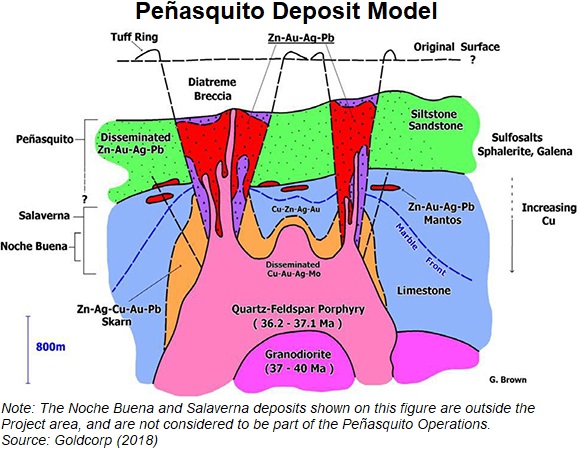 Newmont-Goldcorp (NYSE: NEM) besitzt 100% der Peñasquito Gold-Silber-Zink-Blei-Lagerstätte, Mexikos größter Goldmine und zweitgrößter Silbermine sowie einem der größten Zink- und Bleiproduzenten des Landes: „Zwei Diatrem-Pipes, Peñasco und Brecha Azul, sind die wichtigsten Wirte für die Gold-Silber-Zink-Blei-Mineralisation bei Peñasquito. Die Pipes weiten sich nach oben aus und sind mit Brekzienklasten in einer Matrix mit ähnlicher lithologischer Zusammensetzung gefüllt. Die Diatreme sind von zusammenhängenden Halos aus niedriggradigem, disseminiertem Sphalerit, Galenit und gold- und silberhaltigen Sulfosalzen umgeben. In der Tiefe zwischen den Diatremen Peñasco und Brecha Azul wurde eine polymetallische Mineralisation mit Granat-Skarn identifiziert. Der Skarn hat eine horizontale Ausdehnung von etwa 1.000 x 1.200 m und ist in der Tiefe offen.“ (Quelle)