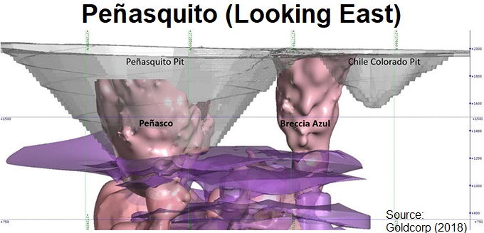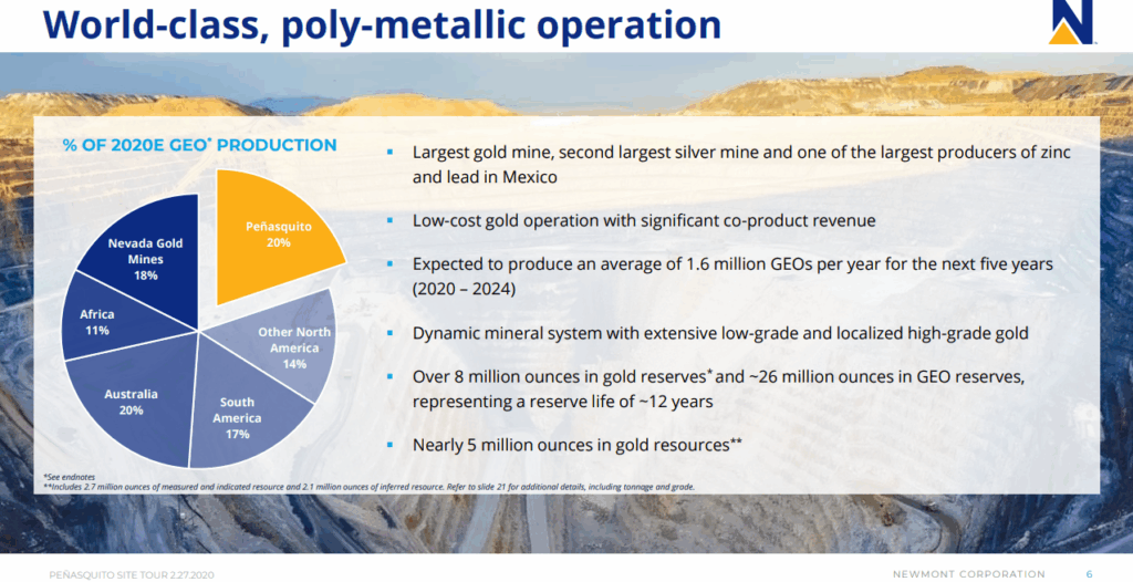 Die Peñasquito Gold-Silber-Zink-Blei-Mine von Newmont-Goldcorp produzierte im Jahr 2018 rund 272.000 Unzen Gold, was laut Scotiabank etwa 17% des Nettovermögenswerts („net asset value“) der beiden Unternehmen ausmacht. Peñasquito ist die 5. größte Silbermine der Welt (die 2. rößte in Mexiko) und Mexikos größter Tagebaubetrieb, der aus 2 Gruben (Peñasco und Chile Colorado) besteht und zwischen 2020 und 2024 jährlich 1,6 Mio. GEOs (Goldäquivalent-Unzen) produzieren soll (2020E-GEO-Aufschlüsselung: 37% Gold, 28% Zink, 25% Silber, 10% Blei).