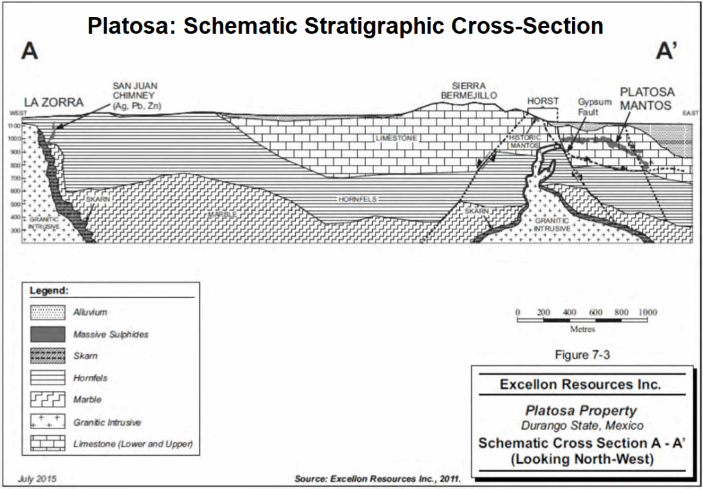 “Die Platosa-Mine baut eine Reihe typischer, wenn auch sehr hochgradiger Massivsulfid-, distaler CRD-Silber-, Blei- und Zink-Manto-Lagerstätten ab, die sich strategisch günstig in der Mitte des produktiven mexikanischen CRD-Gürtels befinden. Die Ergebnisse der Kernbohrungen in den Jahren 2013 und 2014 bestätigten weiterhin, dass das Platosa-Grundstück ein beträchtliches Potential für die Entdeckung zusätzlicher hochgradiger Manto-Mineralisationen und für die Entdeckung großtonniger, jedoch niedriggradiger, proximaler Skarn-Mineralisationeb aufweist. Bei CRDs handelt es sich um epigenetische, intrusionsbedingte, sulfiddominante, blei-zink-silber-kupfer-goldreiche Lagerstätten, die in der Regel in Clustern in Verbindung mit großen regionalen geologischen Merkmalen auftreten. Der mexikanische CRD-Gürtel ist vielleicht der am besten erschlossene CRD-Cluster der Welt, wobei die typischen Lagerstättengrößen innerhalb des Gürtels zwischen 10 und 15 Mio. t liegen.“