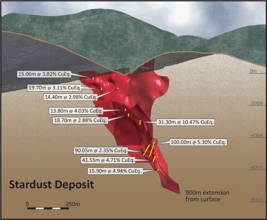 Stardust ist ein großes mineralisiertes System mit echtem Distriktpotenzial. Es verfügt über einen 2,2 km langen Mineralisierungskorridor mit 4 für ein CRD-System typischen Mineralisierungsarten: Porphyr, Skarn, Manto und epithermale Ader. Stardust ist eines der wenigen CRD-Systeme weltweit, bei dem alle CRD-Komponenten vollständig intakt sind.“