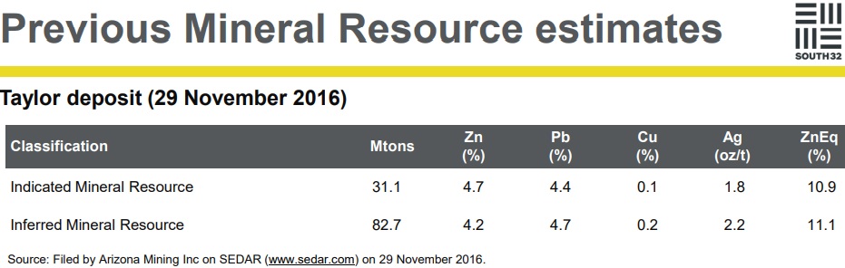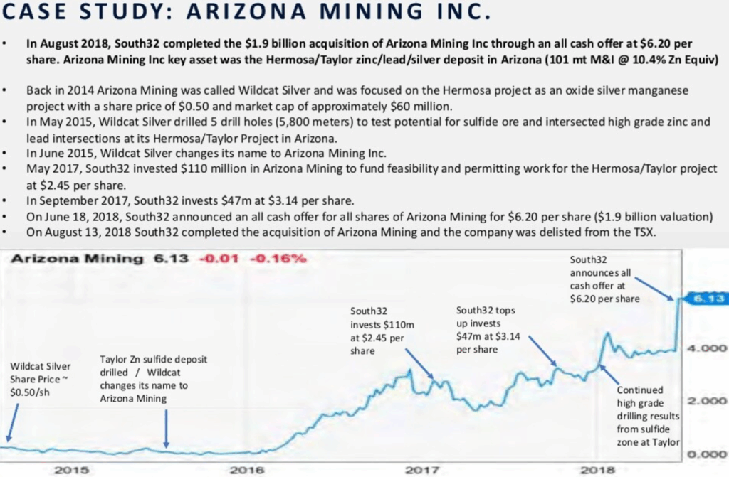Am 17. Juni 2018 übernahm die an der ASX notierte South32 Ltd. für ein All-Cash-Angebot von $1,8 Mrd. CAD die an der TSX notierte Arizona Minerals Inc. (der Angebotspreis von $6,20 CAD pro Aktie entsprach einem Aufschlag von 50% gegenüber dem Schlusskurs des Vortags).