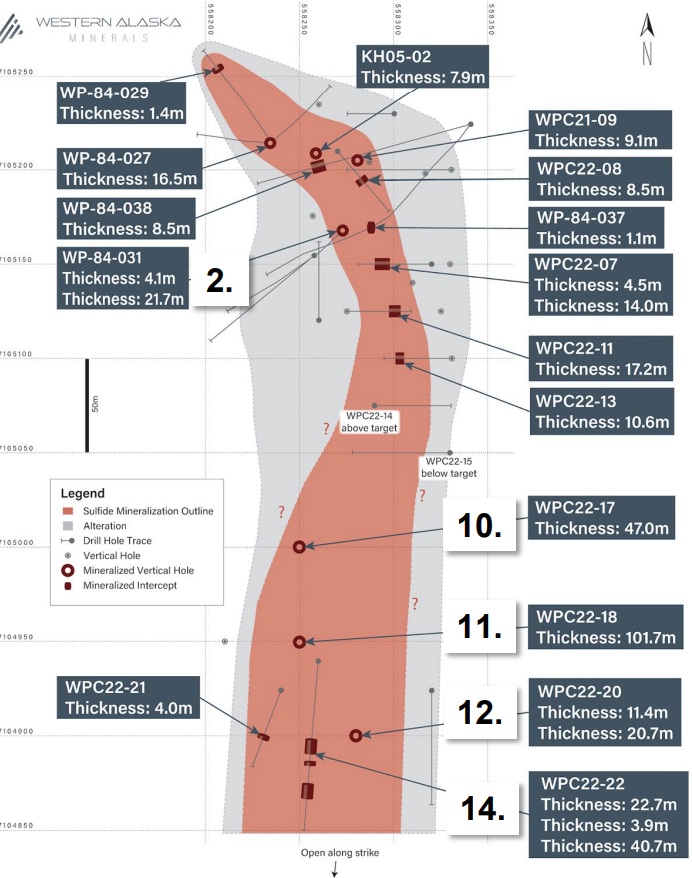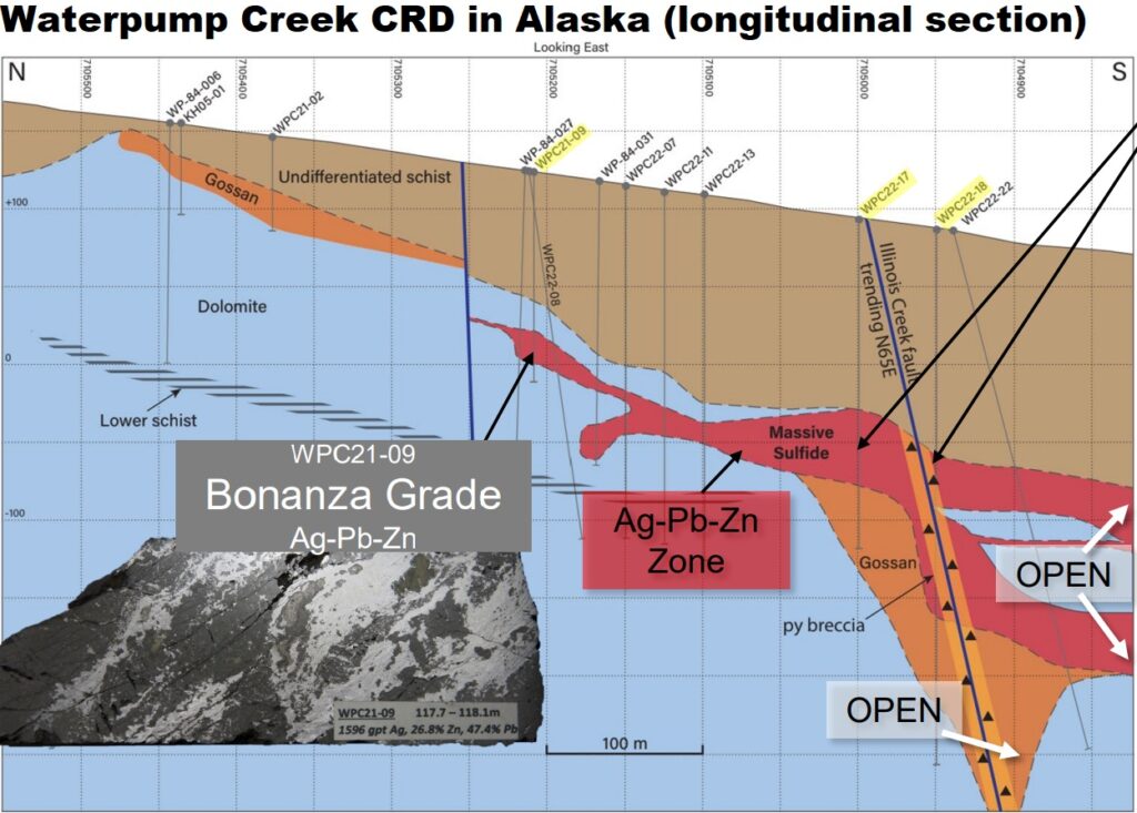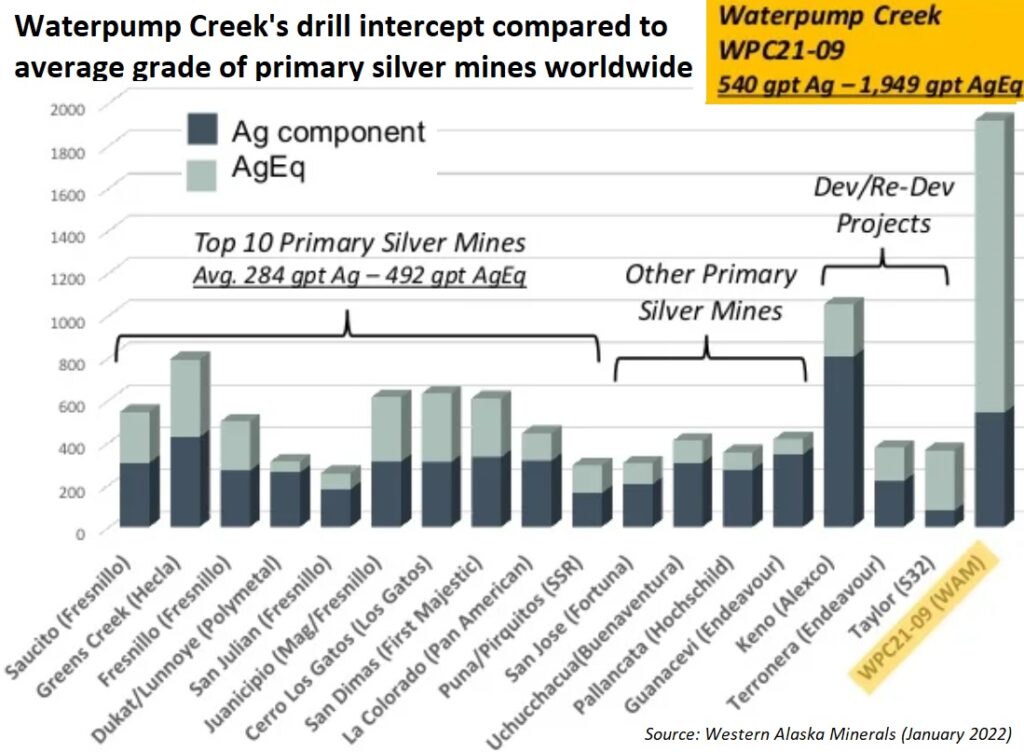 Im Jahr 2021 testete Western Alaska die Waterpump Creek Lagerstätte zum ersten Mal seit 1984 mit Bohrungen: Loch WPC21-09 durchteufte 10,5 m @ 522 g/t Silber, 22,5% Zink und 14,5% Blei nach 109 m Bohrlänge (Bruttometallwert: $1.229 USD/t); Silberäquivalentgehalt: 1.991 g/t)