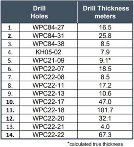 Wie die obige Abbildung zeigt, wurde das Loch WP-84-029 im Jahr 1984 vertikal gebohrt und erzielte eine mineralisierte Mächtigkeit von 1,4 m, wobei die Mächtigkeit in größeren Tiefen in Richtung Süden deutlich zunimmt.