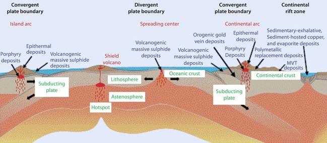CRDs (Carbonate Replacement Deposits) unterscheiden sich von anderen polymetallischen Lagerstättentypen wie VMS (Volcanogenic Massive Sulfides) und MVT (Mississippi-Valley-Type):