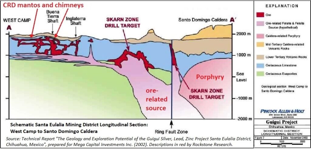 „Das Modell der Karbonat-Verdrängungslagerstätten (CRD) geht auf Dr. Peter Megaws Doktoratsstudien in Santa Eulalia zurück und wurde weltweit wiederholt bestätigt… Der Santa Eulalia Distrikt ist einer der wichtigsten Silber- und Basismetallproduzenten Mexikos und seine größte CRD. Die historische Produktion des Distrikts (1703-2020) beläuft sich auf 51 Mio. t Erz mit durchschnittlichen Gehalten von 310 g/t Ag, 8,2% Pb und 7,1% Zn, was insgesamt 500 Mio. Unzen Ag, 4 Mio. t Pb und 3,6 Mio. t Zn ergibt.“ (Quelle)